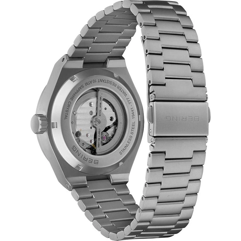 This Bering watch has a case made of stainless steel with a diameter of 41 mm and is fitted with a metal band. Inside the case lies a Miyota movement and the watch features a Sapphire crystal.