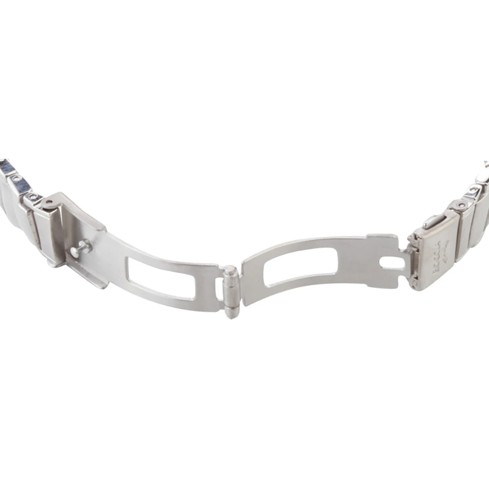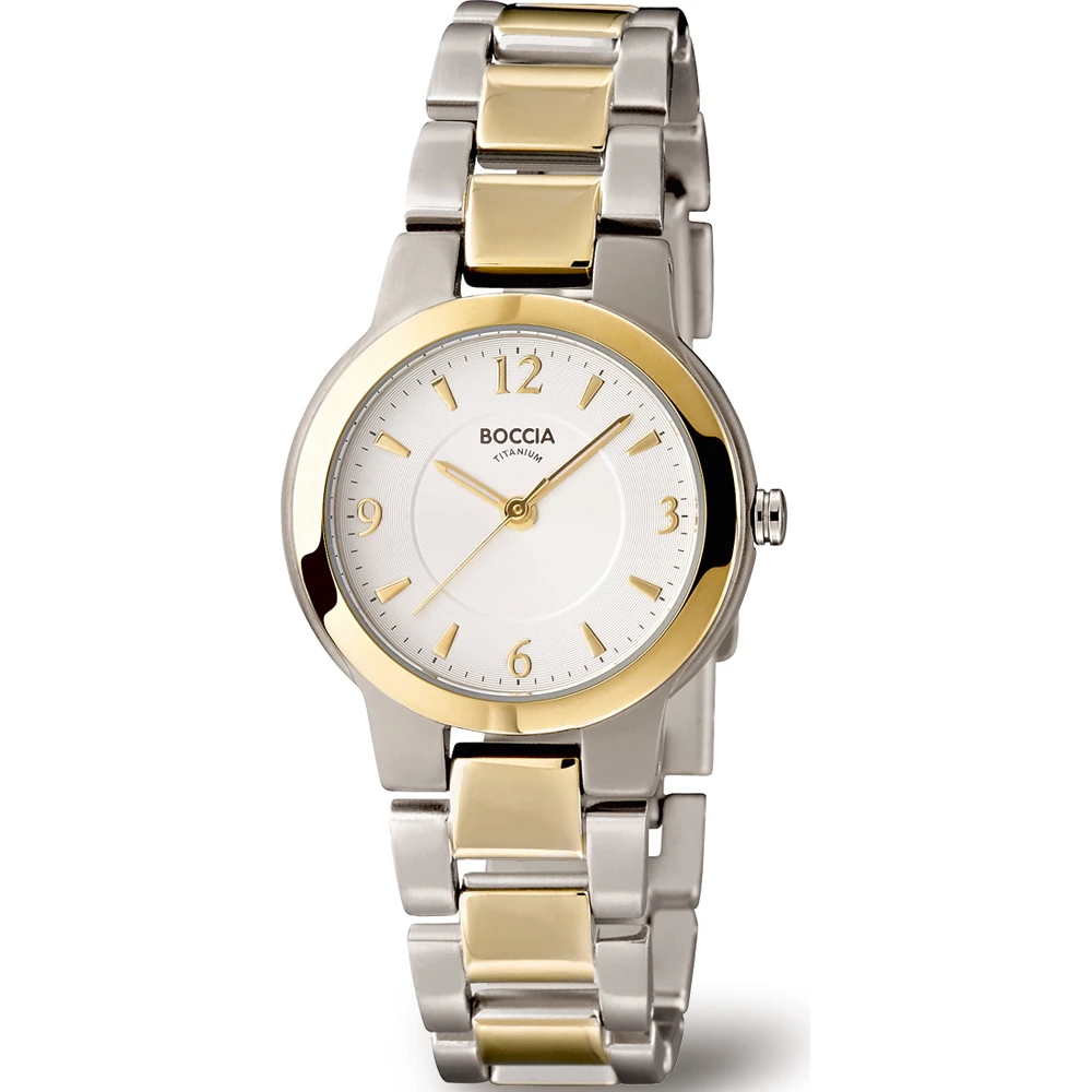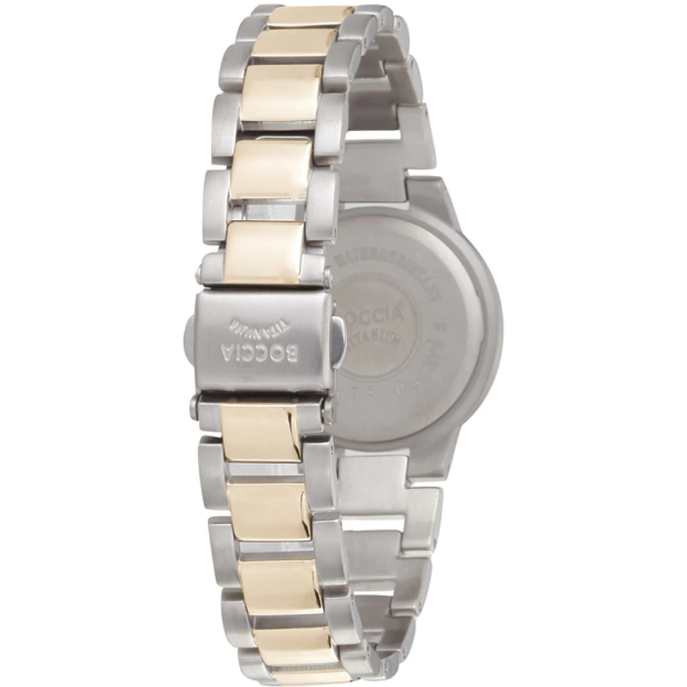 This Boccia watch has a case made of titanium with a diameter of 29 mm and is fitted with a titanium band. Inside the case lies a Ronda movement and the watch features a Mineral crystal.