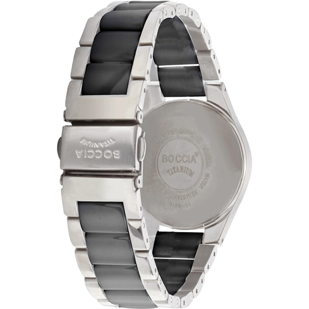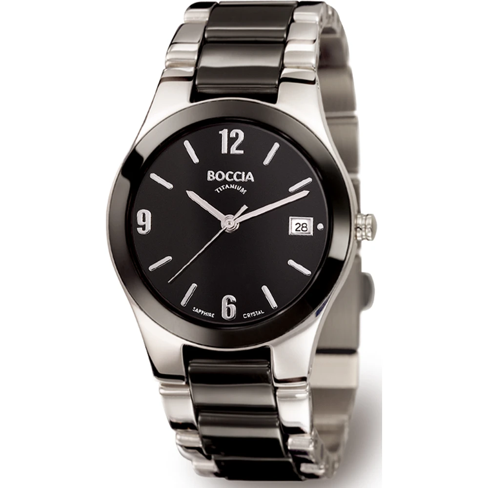 This Boccia watch has a case made of titanium with a diameter of 32 mm and is fitted with a titanium band. Inside the case lies a Seiko Instruments Inc. movement and the watch features a Sapphire crystal.