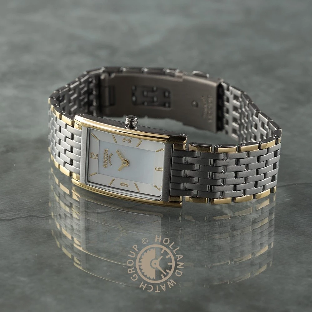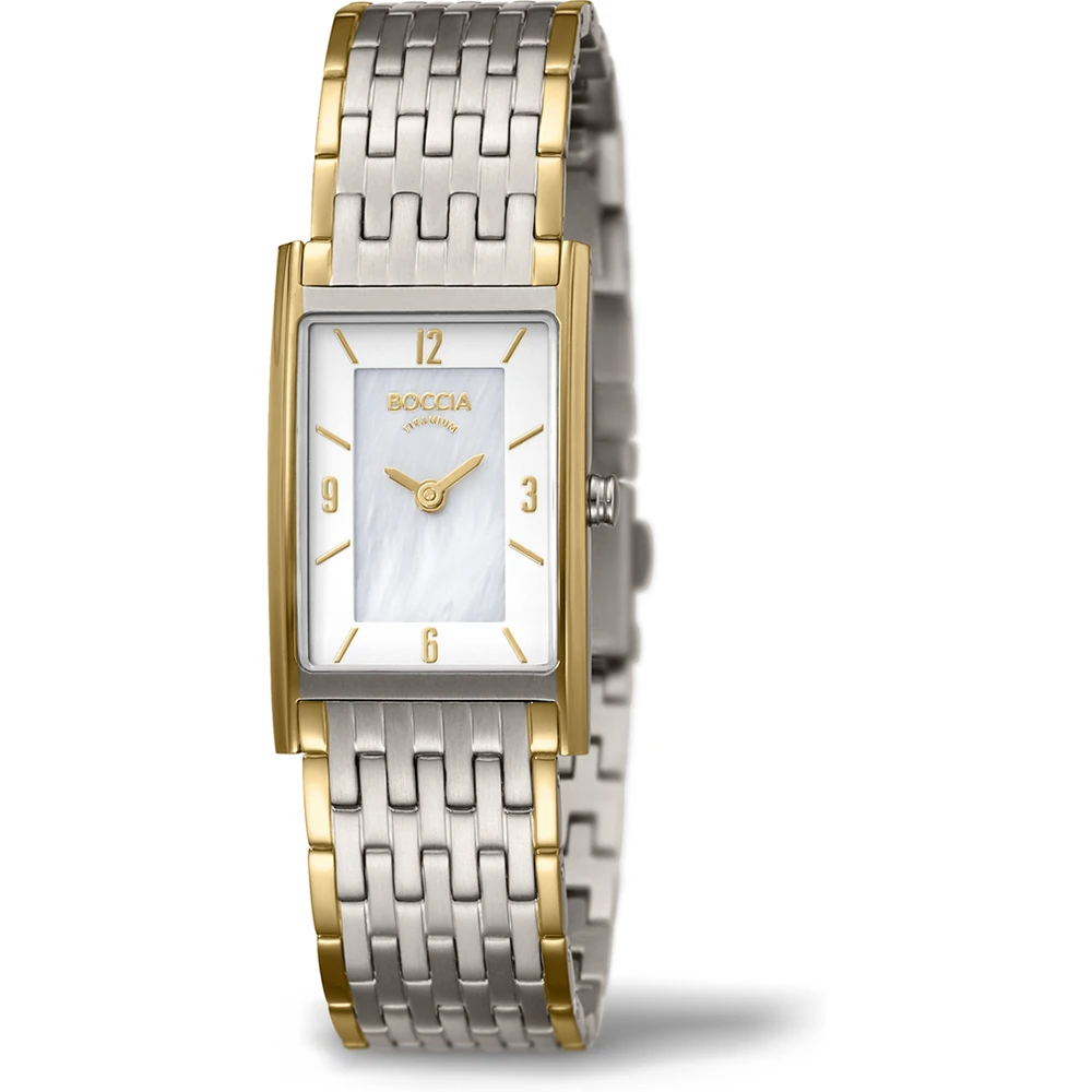 This Boccia watch has a case made of titanium with a diameter of 21.5 mm and is fitted with a titanium band. Inside the case lies a Ronda movement and the watch features a Mineral crystal.