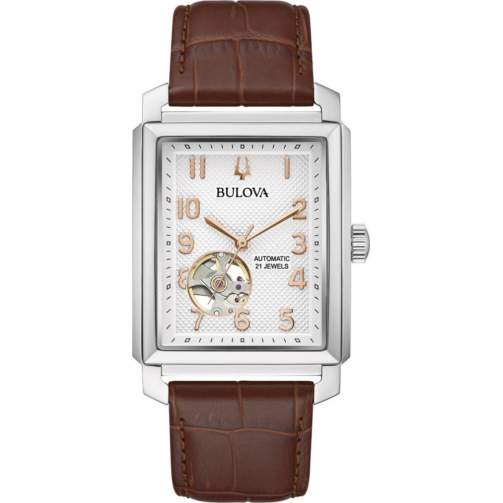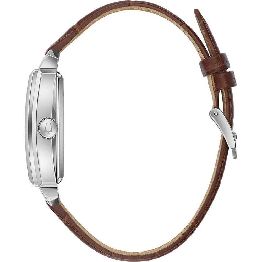 This Bulova watch has a case made of stainless steel with a diameter of 33 mm and is fitted with a leather band.