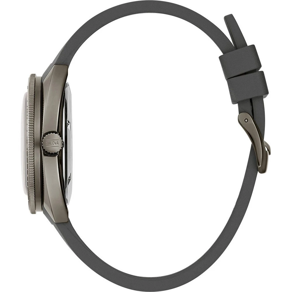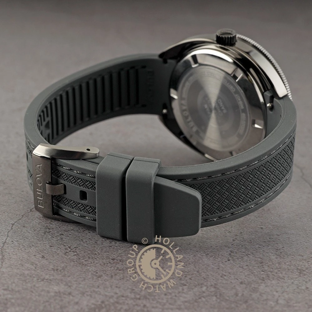 This Bulova watch has a case made of stainless steel with a diameter of 41 mm and is fitted with a rubber band. Inside the case lies a Miyota movement and the watch features a Sapphire crystal.