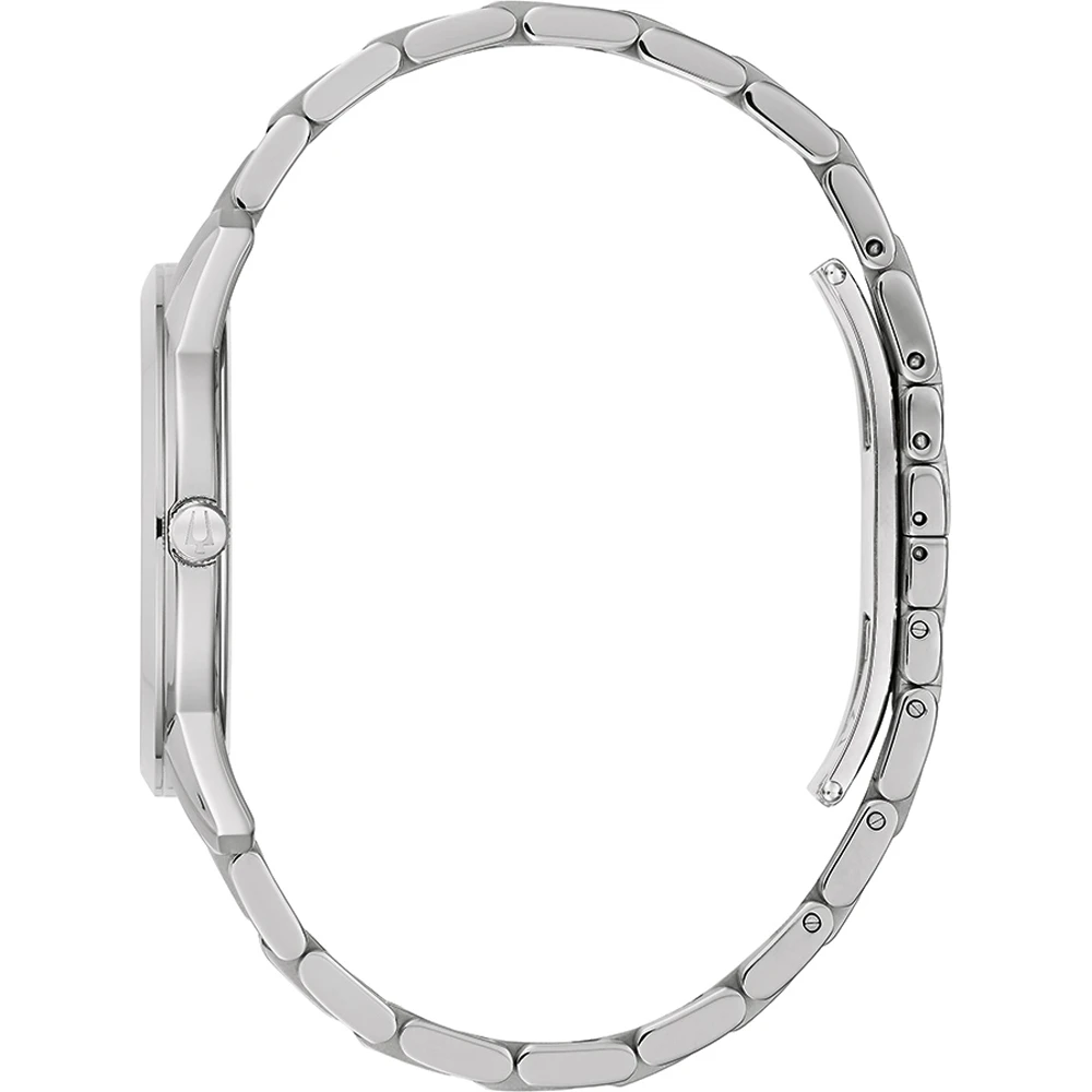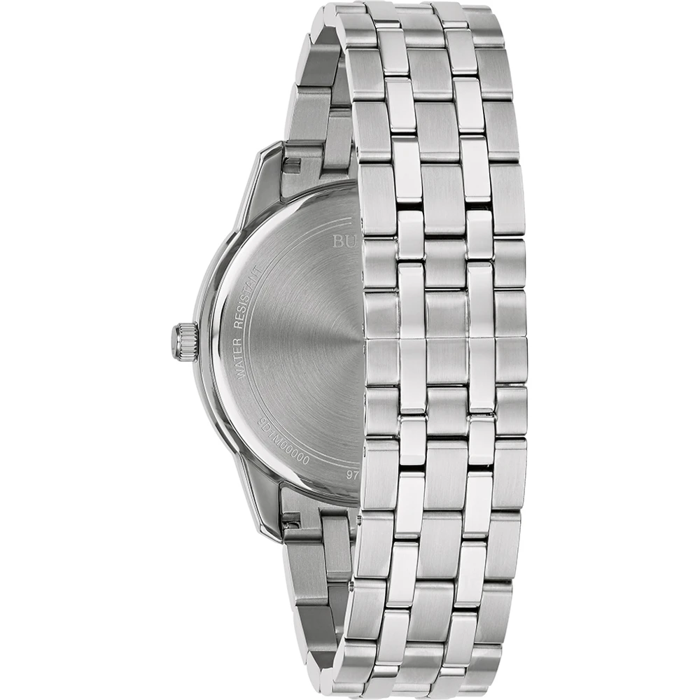 This Bulova watch has a case made of stainless steel with a diameter of 40 mm and is fitted with a metal band. Inside the case lies a Miyota movement and the watch features a Mineral crystal.