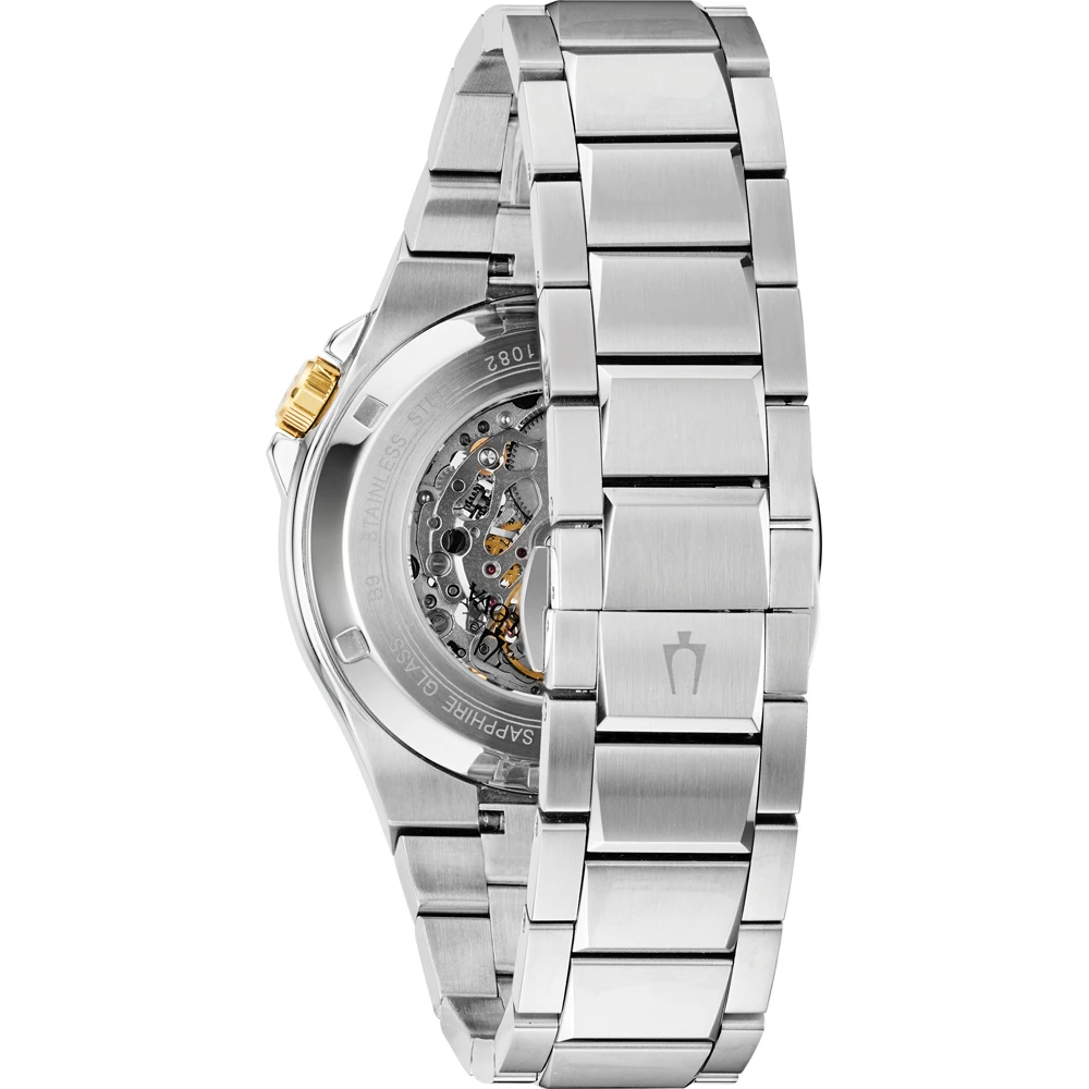This Bulova watch has a case made of stainless steel with a diameter of 46 mm and is fitted with a metal band. Inside the case lies a Miyota movement and the watch features a Sapphire crystal.