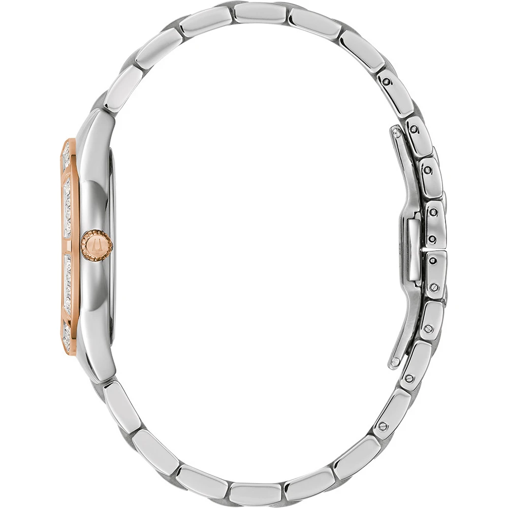 This Bulova watch has a case made of stainless steel with a diameter of 32.5 mm and is fitted with a metal band. Inside the case lies a Miyota movement and the watch features a Sapphire crystal.