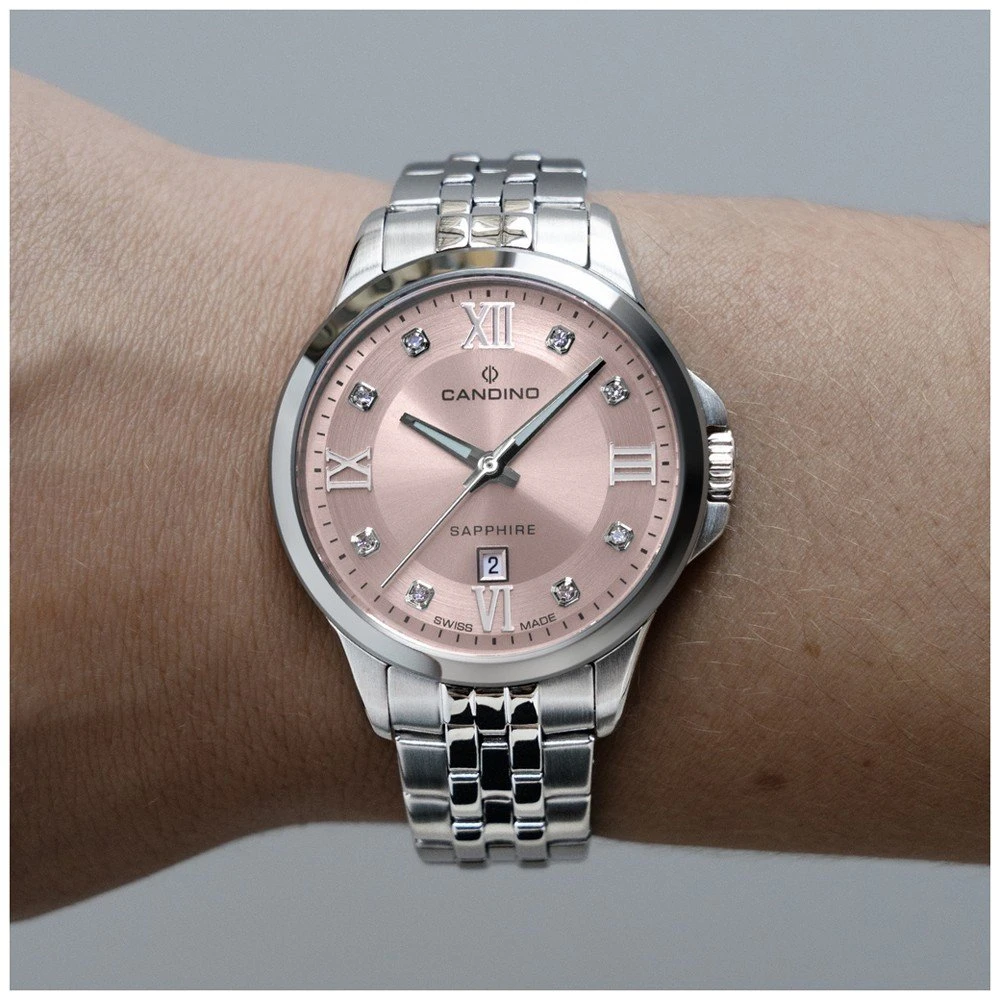 This Candino watch has a case made of stainless steel with a diameter of 34 mm and is fitted with a metal band. Inside the case lies a Ronda movement and the watch features a Sapphire crystal.