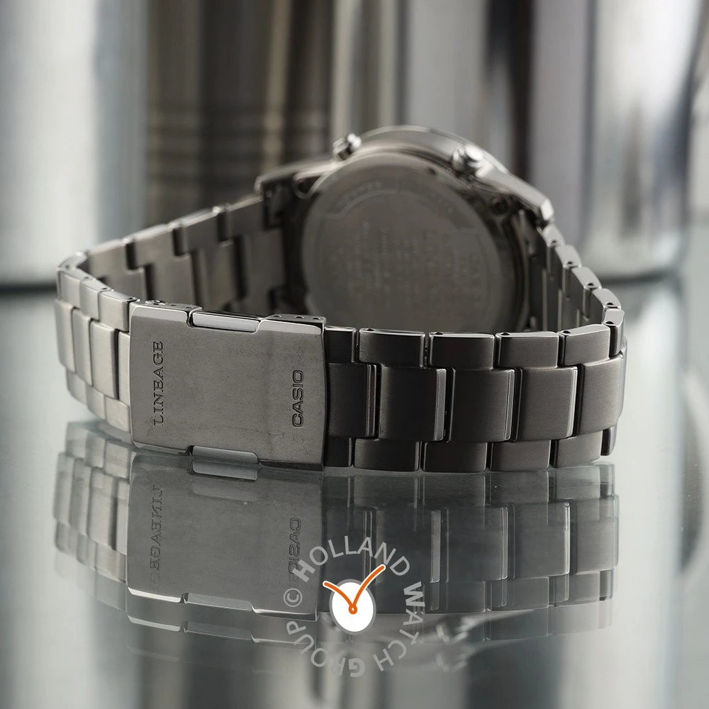 This Casio watch has a case made of titanium with a diameter of 39.5 mm and is fitted with a titanium band. Inside the case lies a Casio movement and the watch features a Sapphire crystal.