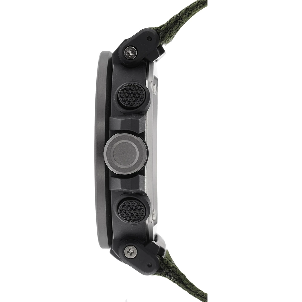 This Casio watch has a case made of plastic with a diameter of 51.5 mm and is fitted with a textile band. Inside the case lies a Casio movement and the watch features a Mineral crystal.