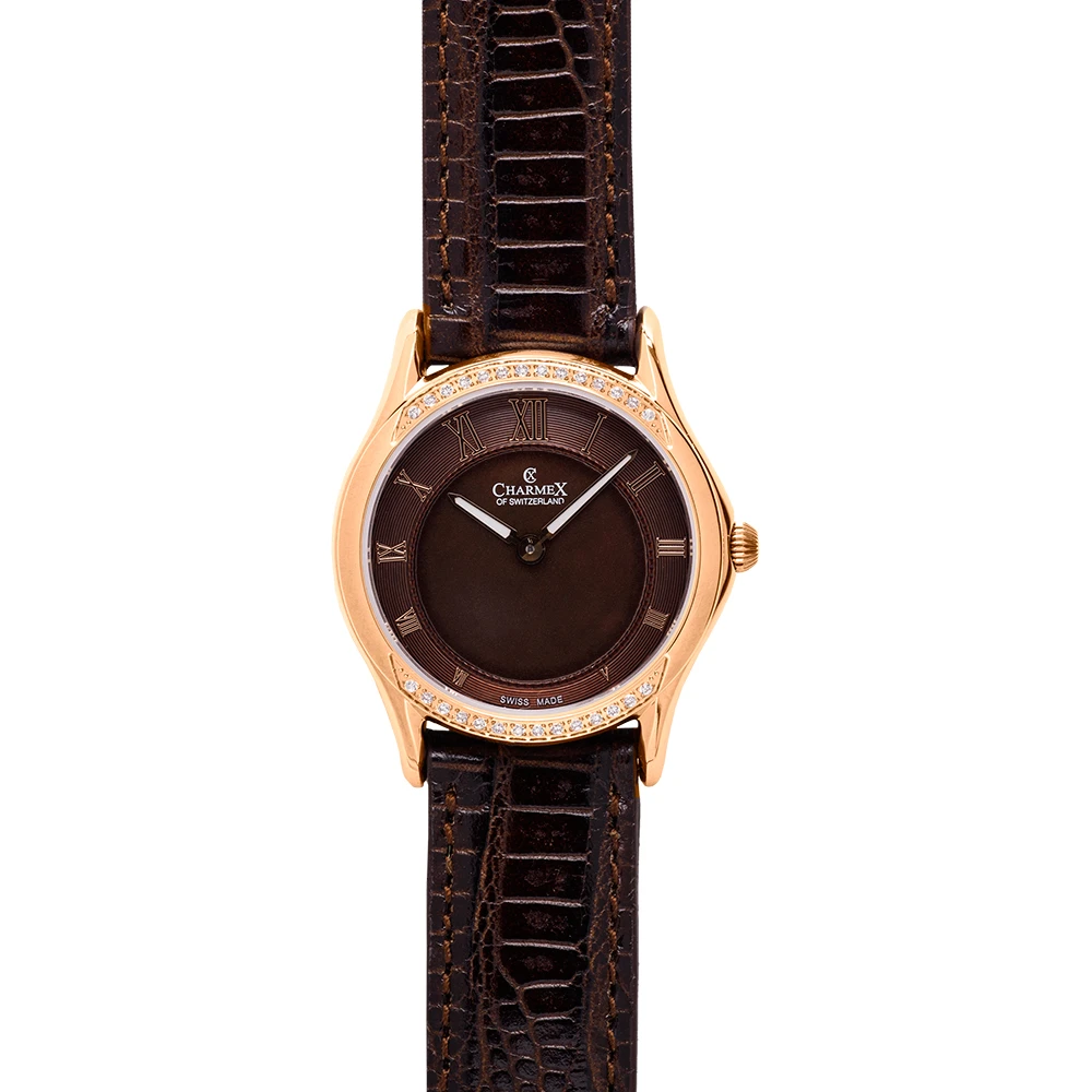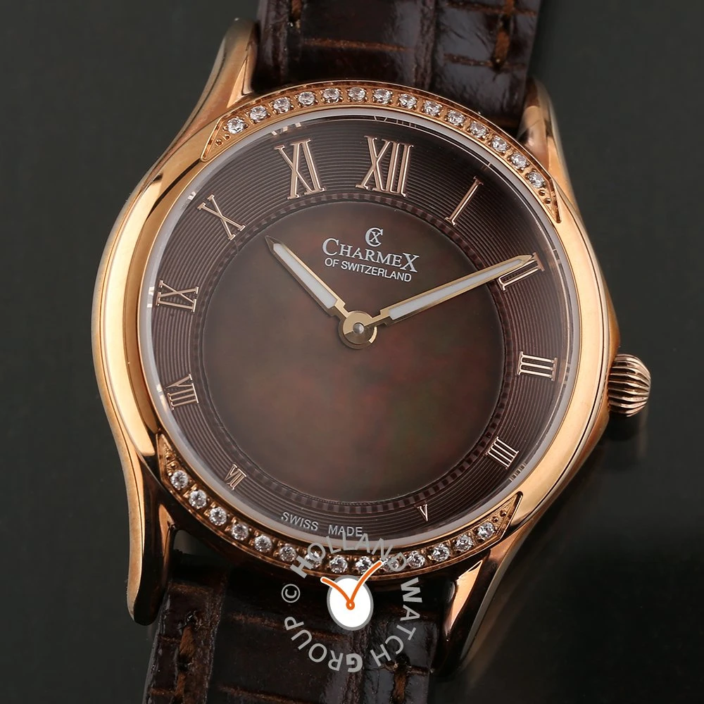 This Charmex of Switzerland watch has a case made of stainless steel with a diameter of 30 mm and is fitted with a leather band. Inside the case lies a Ronda movement and the watch features a Sapphire crystal.