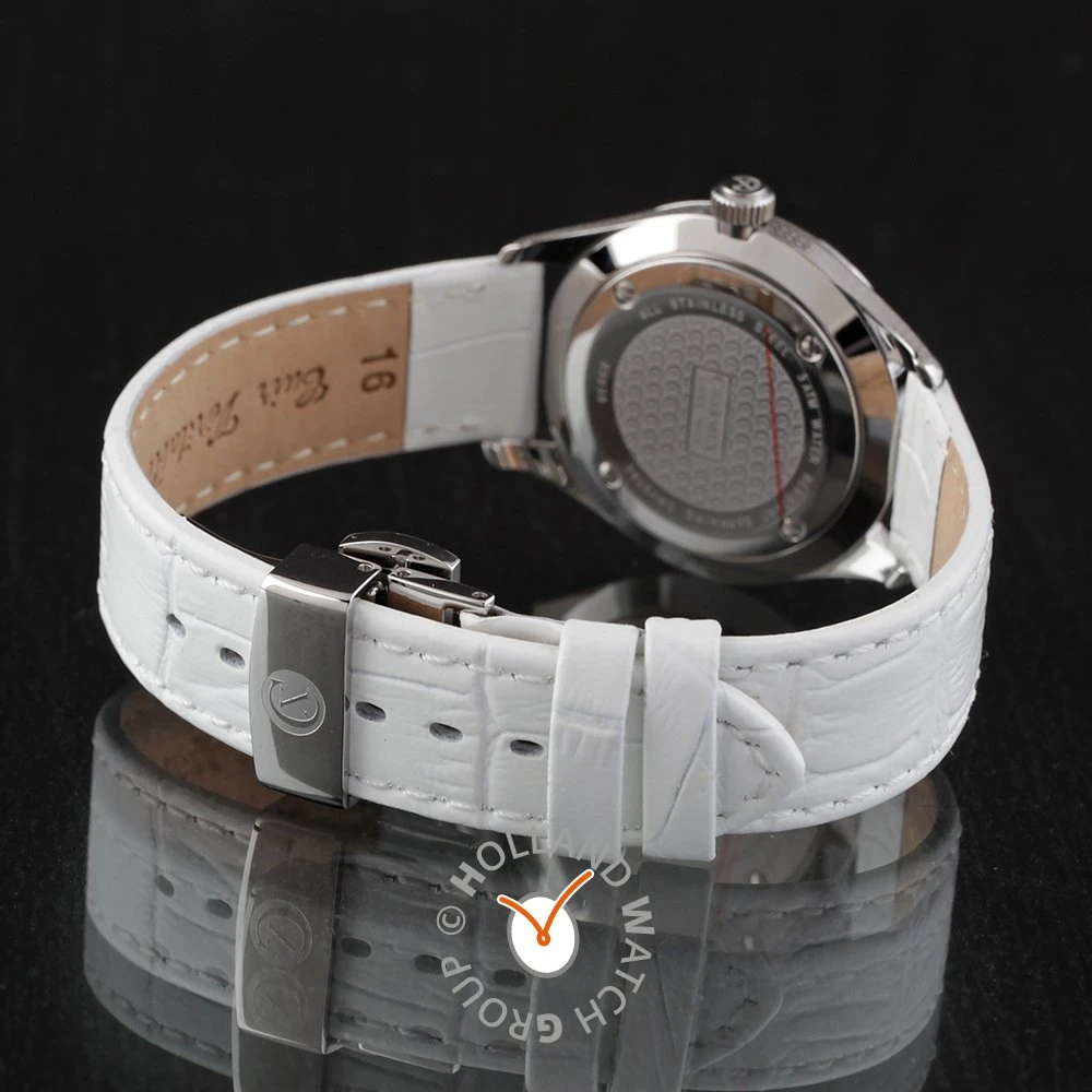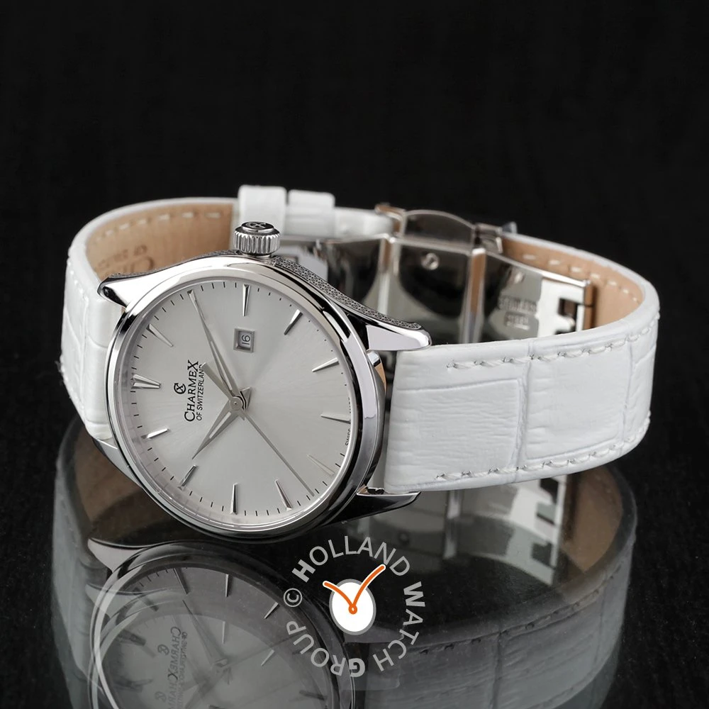 This Charmex of Switzerland watch has a case made of stainless steel with a diameter of 32 mm and is fitted with a leather band. Inside the case lies a Ronda movement and the watch features a Sapphire crystal.