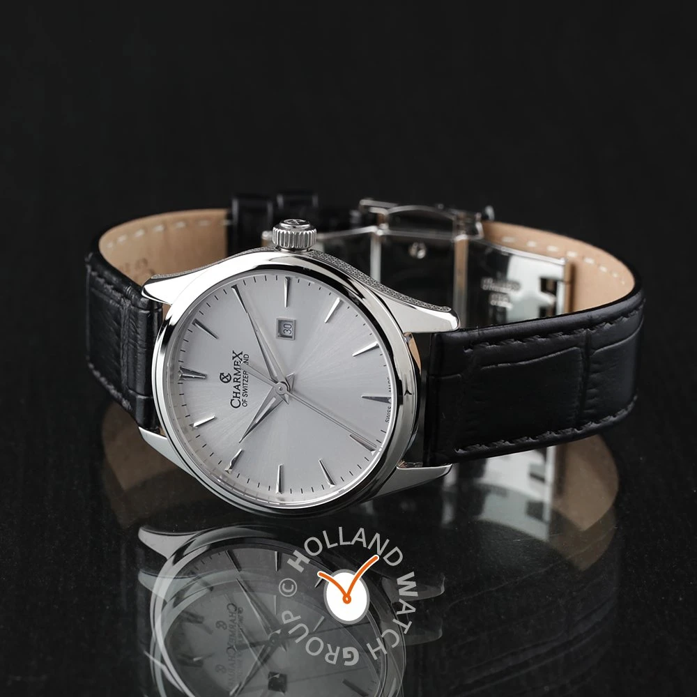 This Charmex of Switzerland watch has a case made of stainless steel with a diameter of 32 mm and is fitted with a leather band. Inside the case lies a Ronda movement and the watch features a Sapphire crystal.