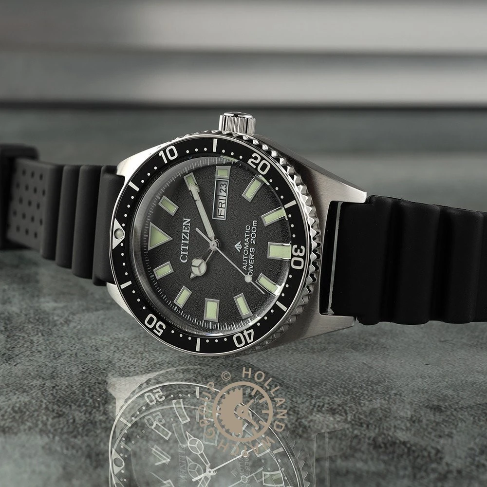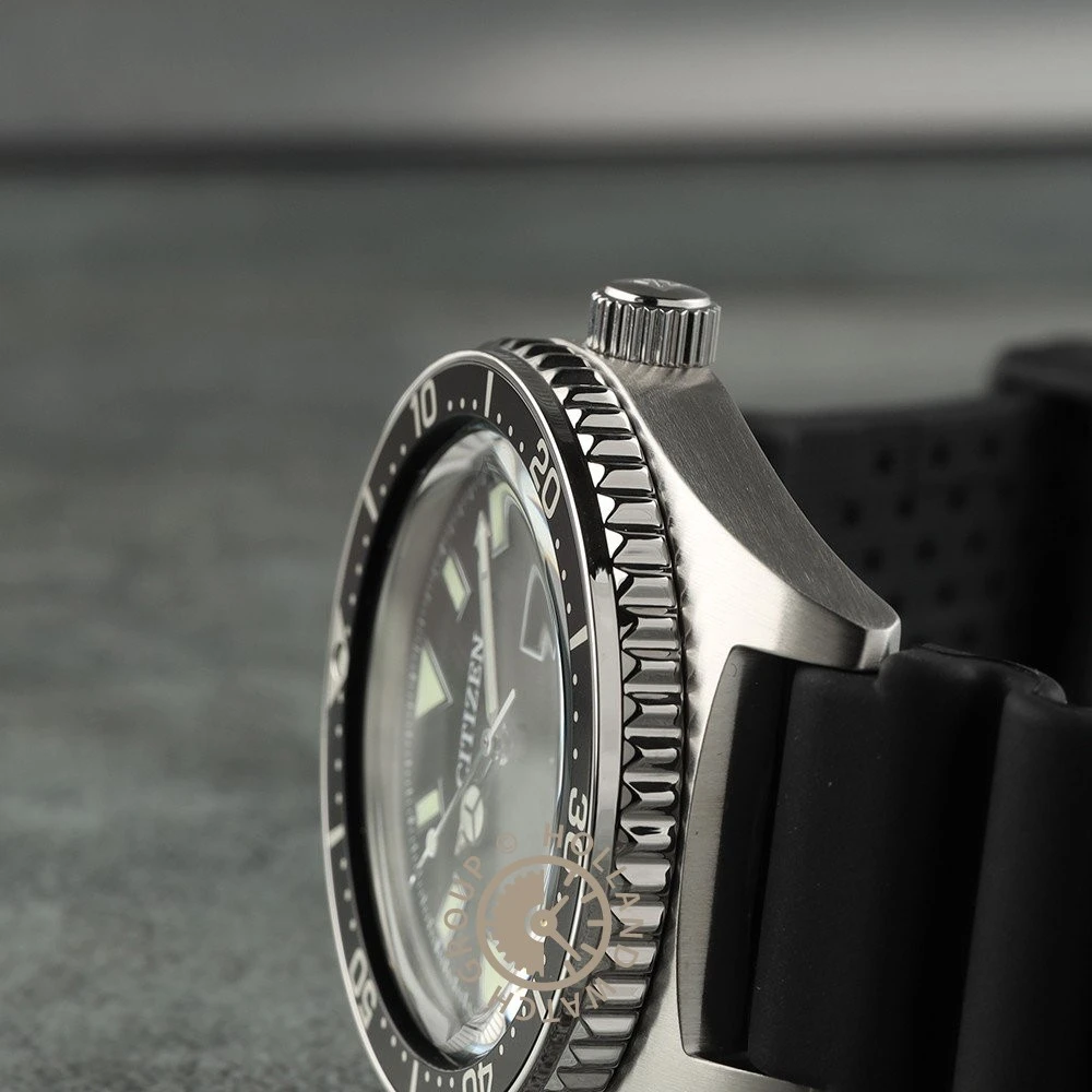 This Citizen watch has a stainless steel case 41 mm in diameter and is fitted with a rubber strap. Inside the case lies a Miyota movement and the watch features a Sapphire crystal.