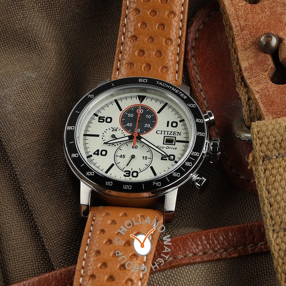 This Citizen watch has a case made of stainless steel with a diameter of 44 mm and is fitted with a leather band. Inside the case lies a Citizen movement and the watch features a Mineral crystal.