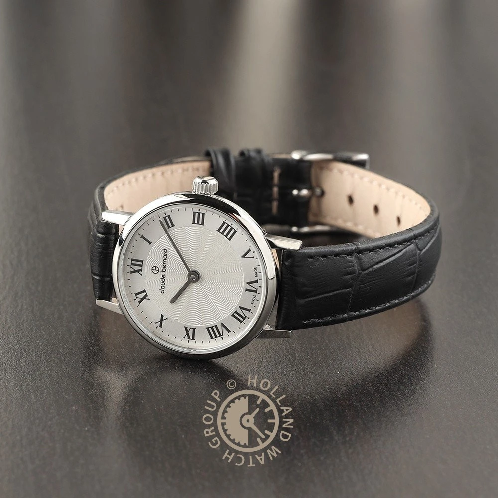 This Claude Bernard watch has a case made of stainless steel with a diameter of 27 mm and is fitted with a leather band. Inside the case lies a Ronda movement and the watch features a Sapphire crystal.