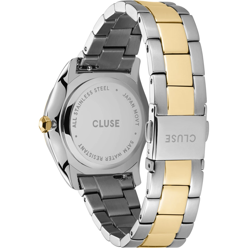 This Cluse watch has a case made of stainless steel with a diameter of 32 mm and is fitted with a metal band. Inside the case lies a Miyota movement and the watch features a Mineral crystal.