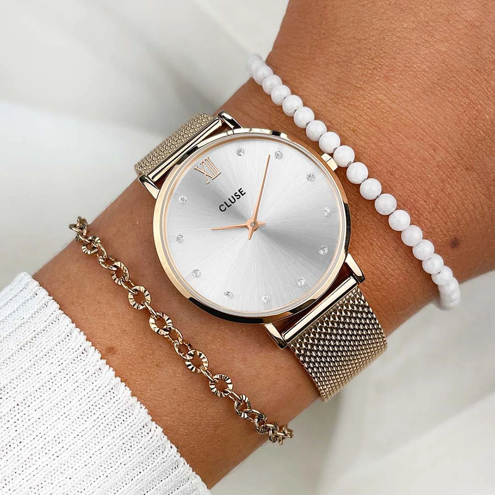 This Cluse watch has a case made of stainless steel with a diameter of 33 mm and is fitted with a metal band. Inside the case lies a Miyota movement and the watch features a Mineral crystal.