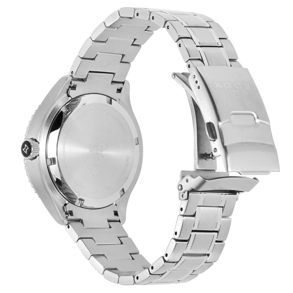This Edox watch has a stainless steel case 44 mm in diameter and is fitted with a metal strap. Inside the case lies a Ronda movement and the watch features a Sapphire crystal.