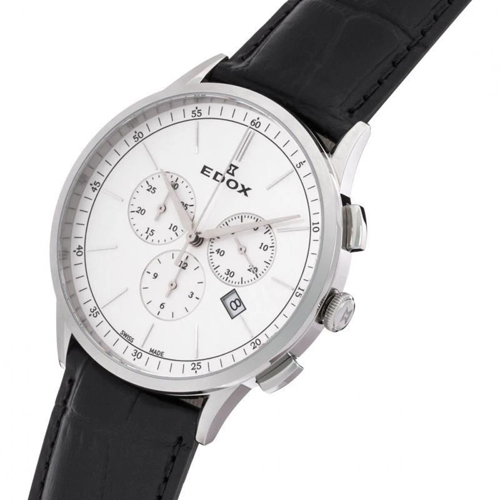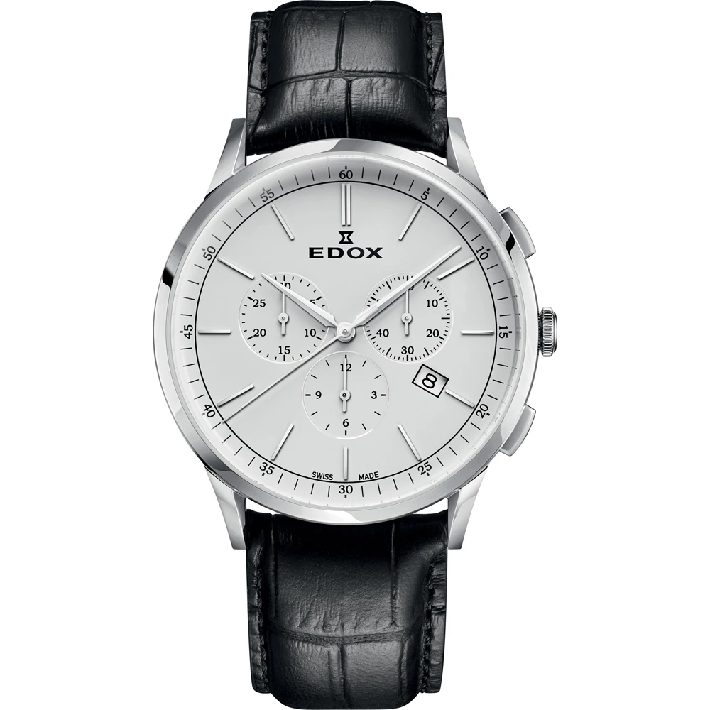This Edox watch has a case made of stainless steel with a diameter of 42 mm and is fitted with a leather band. Inside the case lies a Ronda movement and the watch features a Sapphire crystal.