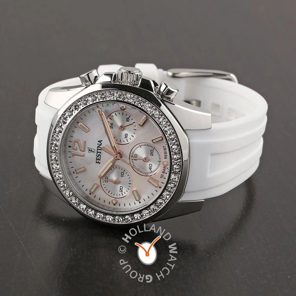 This Festina watch has a case made of stainless steel with a diameter of 38 mm and is fitted with a rubber band. Inside the case lies a Miyota movement and the watch features a Mineral crystal.