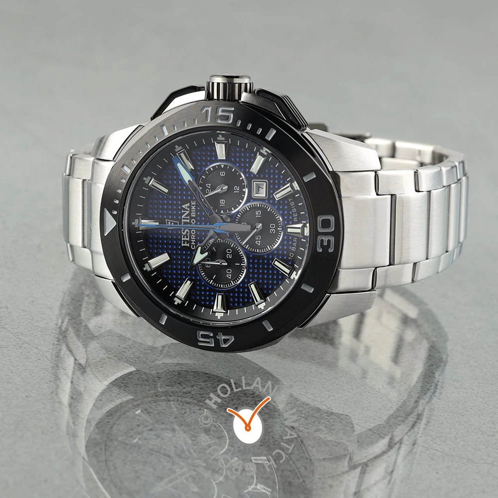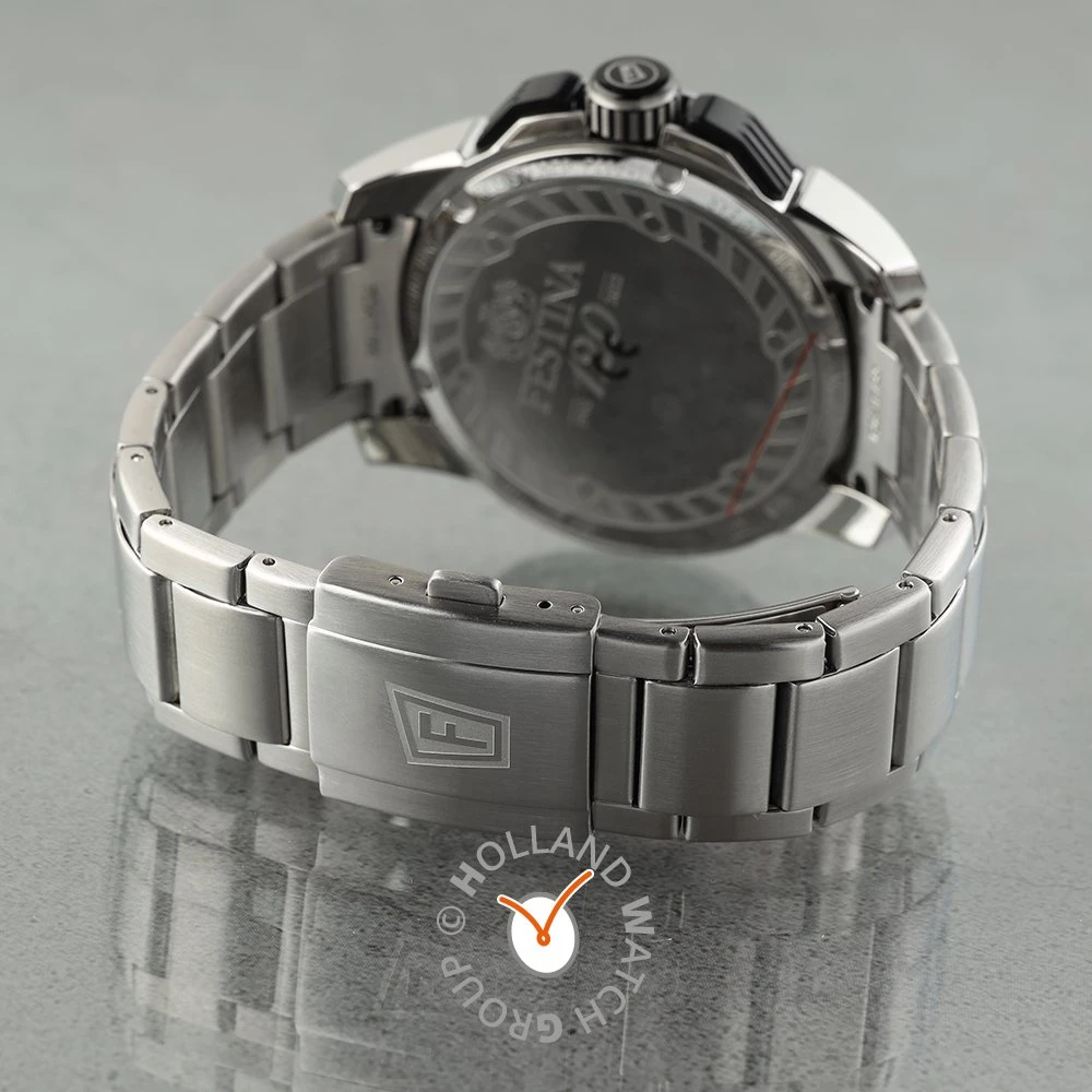 This Festina watch has a case made of stainless steel with a diameter of 47 mm and is fitted with a metal band. Inside the case lies a Miyota movement and the watch features a Mineral crystal.