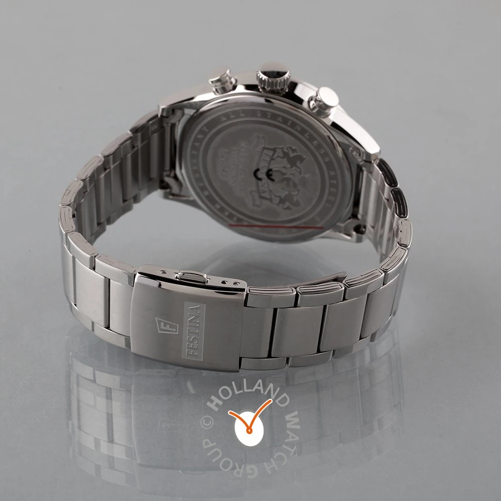 This Festina watch has a case made of stainless steel with a diameter of 43 mm and is fitted with a metal band. Inside the case lies a Miyota movement and the watch features a Mineral crystal.