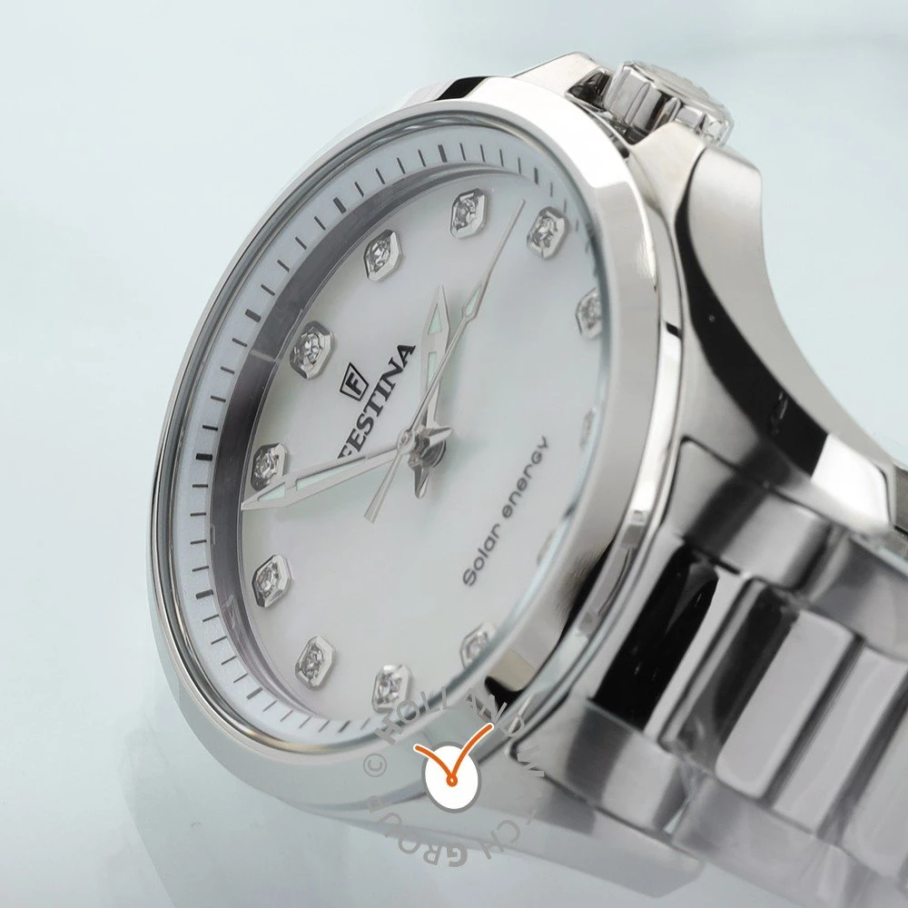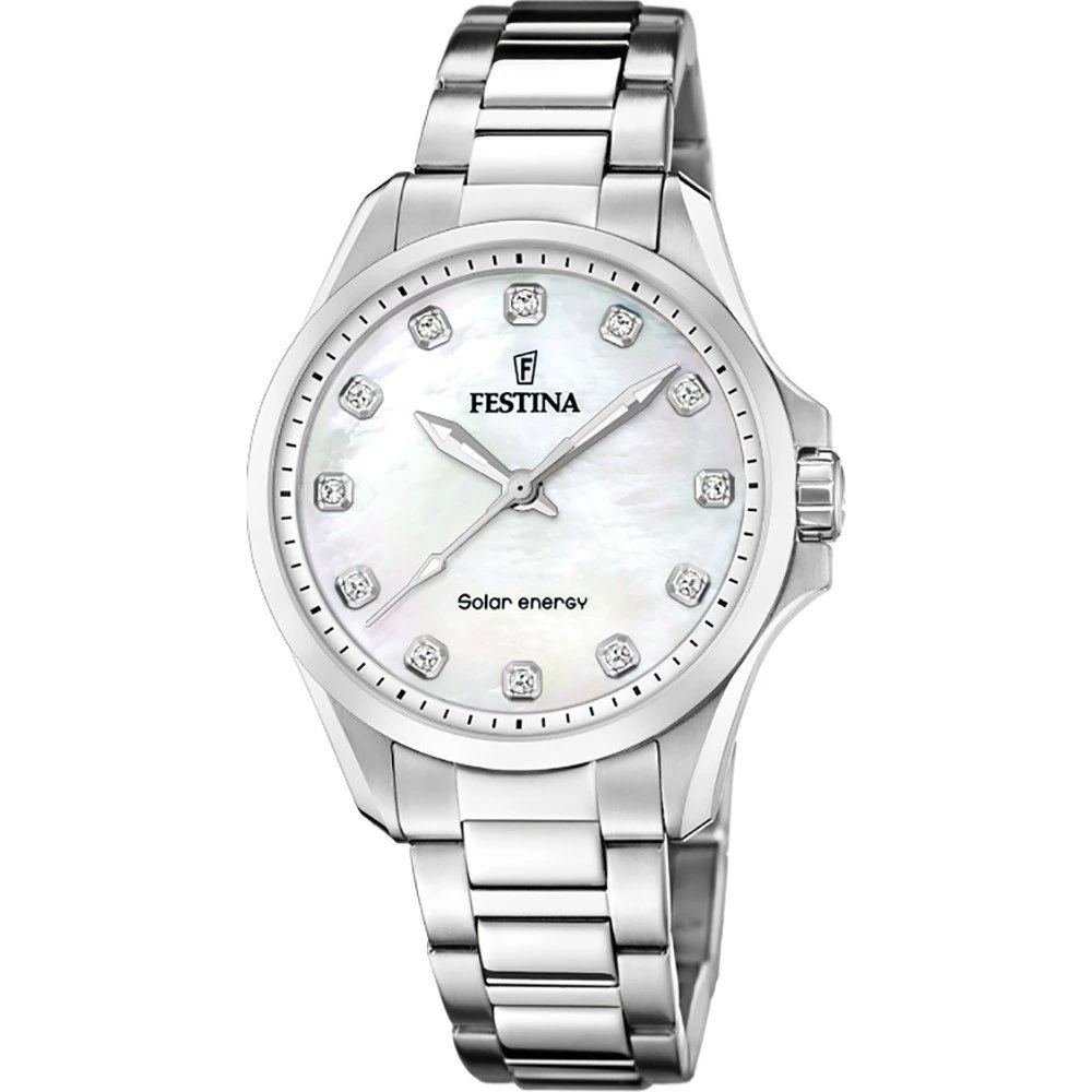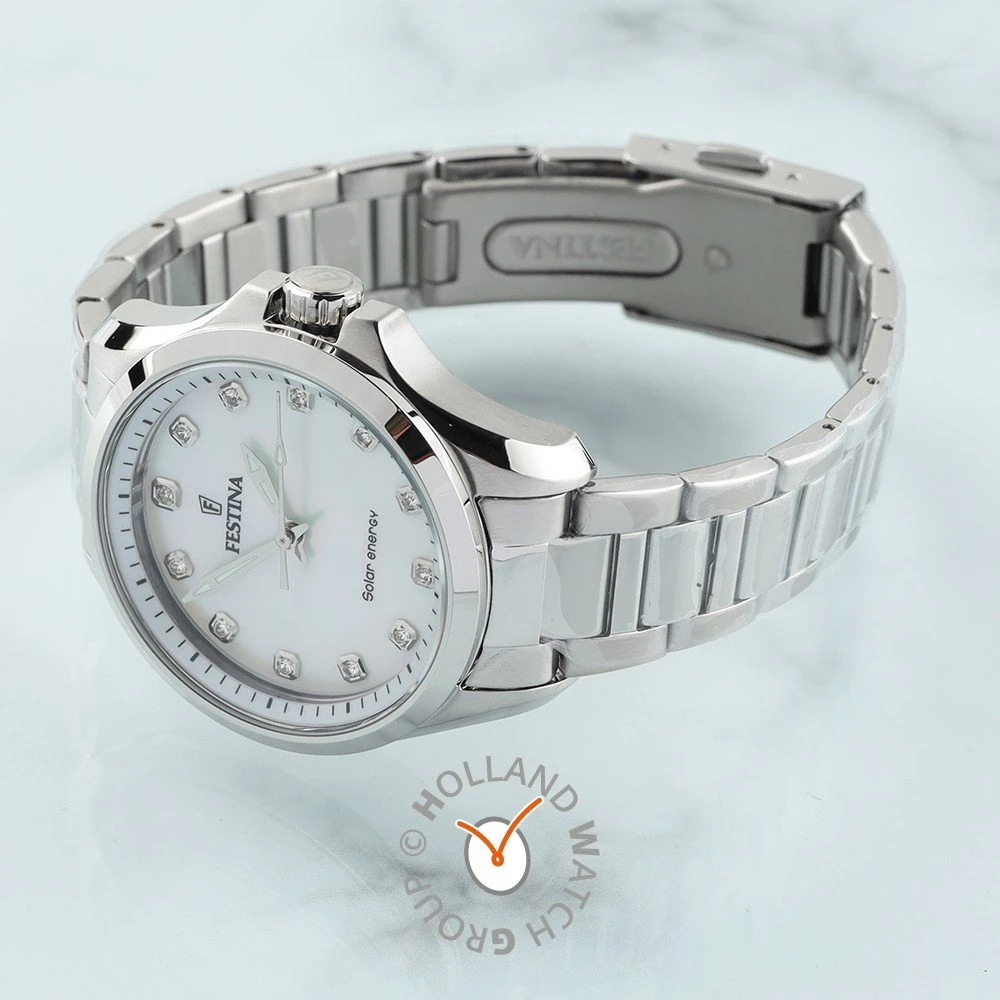 This Festina watch has a case made of stainless steel with a diameter of 34 mm and is fitted with a metal band. Inside the case lies a Miyota movement and the watch features a Mineral crystal.
