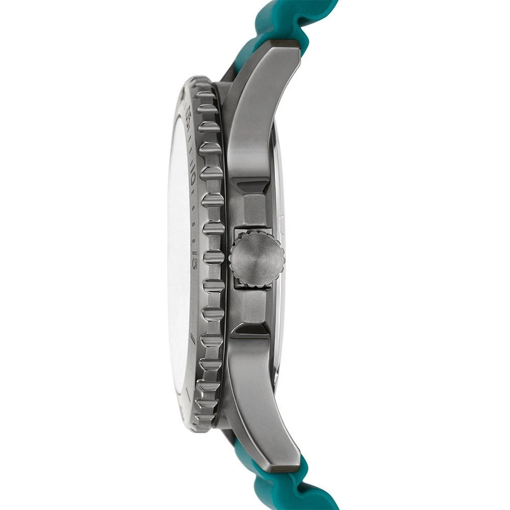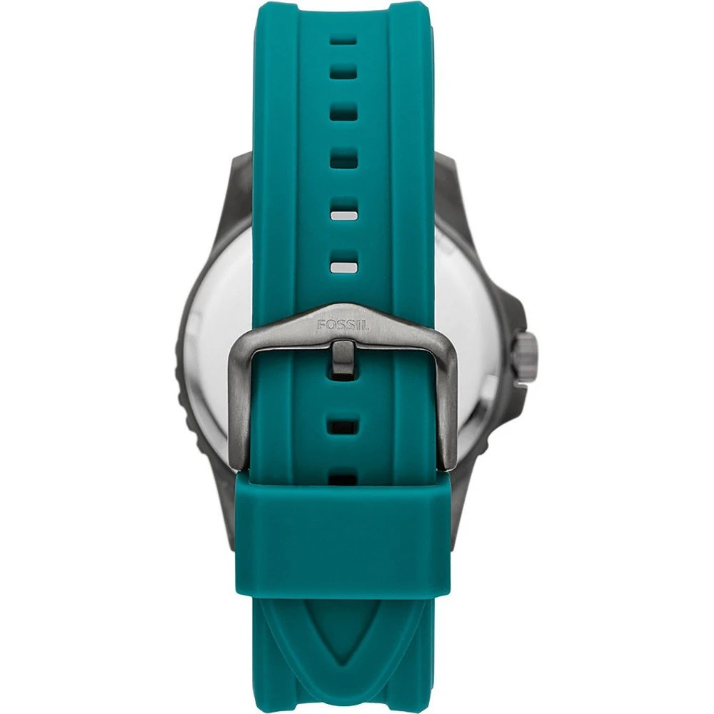 This Fossil watch has a case made of stainless steel with a diameter of 42 mm and is fitted with a rubber band. Inside the case lies a Miyota movement and the watch features a Mineral crystal.