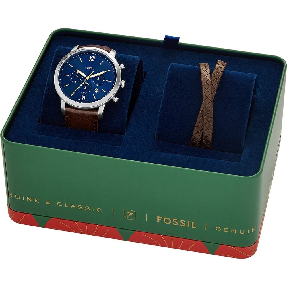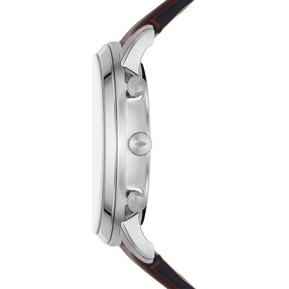This Fossil watch has a case made of stainless steel with a diameter of 44 mm and is fitted with a leather band. Inside the case lies a Miyota movement and the watch features a Mineral crystal.