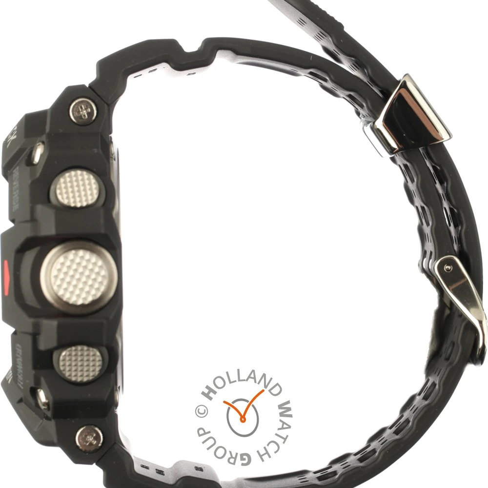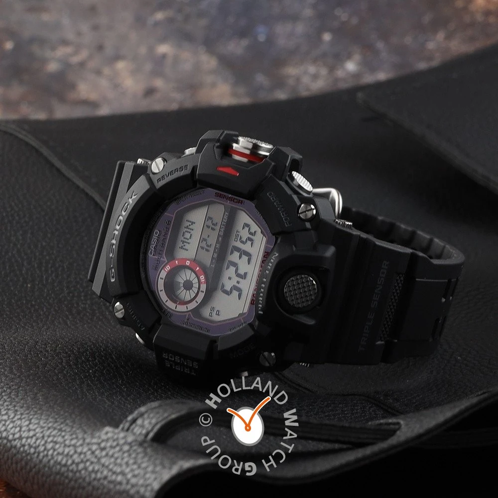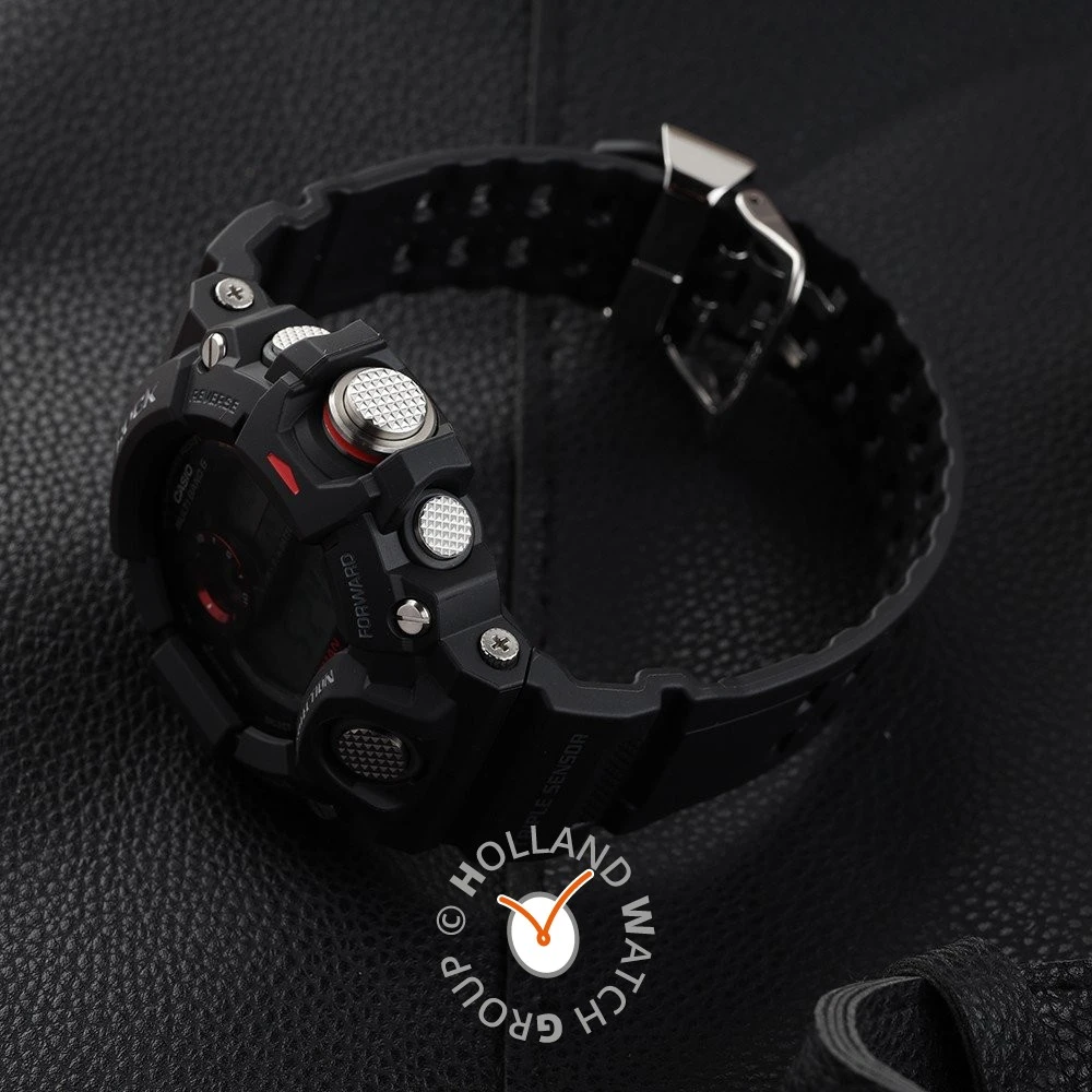 G-Shock GW-9400-1ER Rangeman is a completely black resin watch. Special features such as solar power, radio signal reception, barometer, thermometer, digital compass, altimeter, sunrise/sunset display, timer, 5 alarms, automatic calendar, battery level indicator and 20 ATM water resistance make it the perfect accessory for extreme outdoor activities.