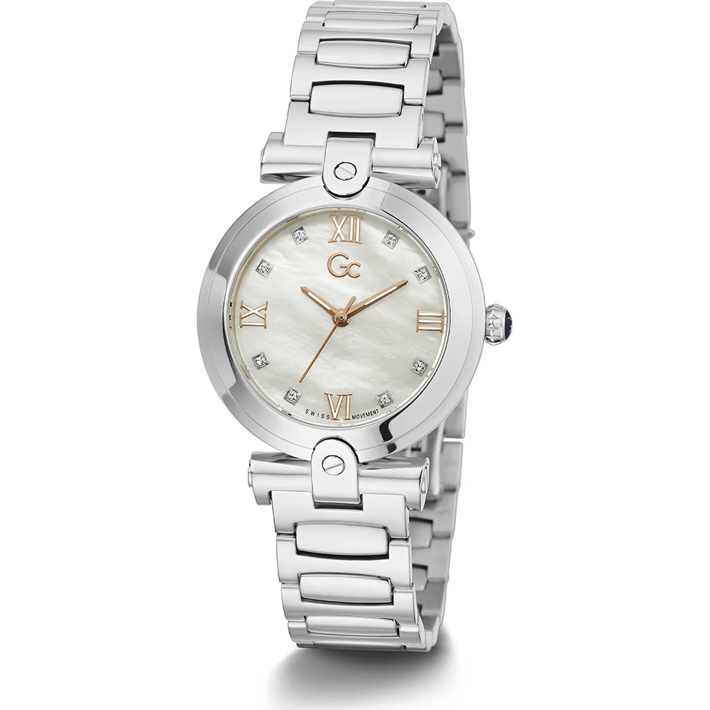 This GC watch has a case made of stainless steel with a diameter of 34 mm and is fitted with a metal band.