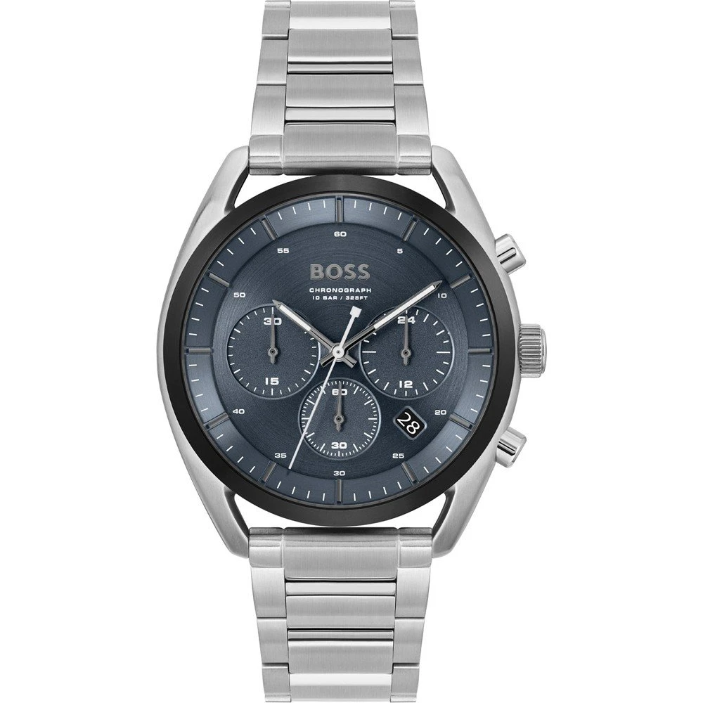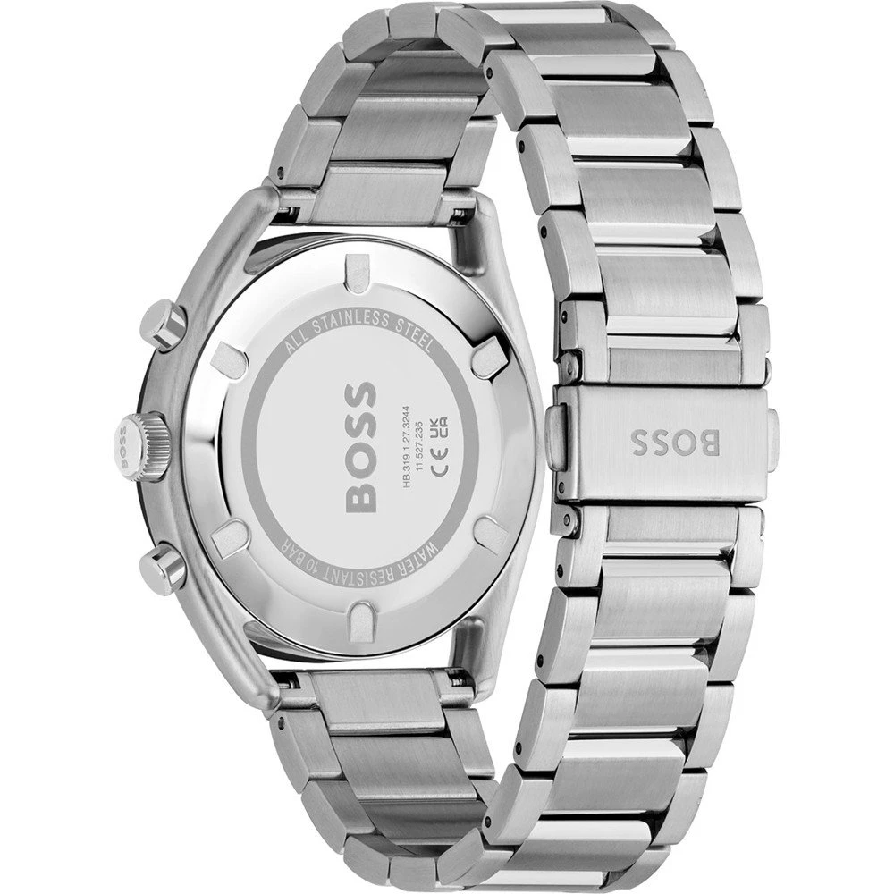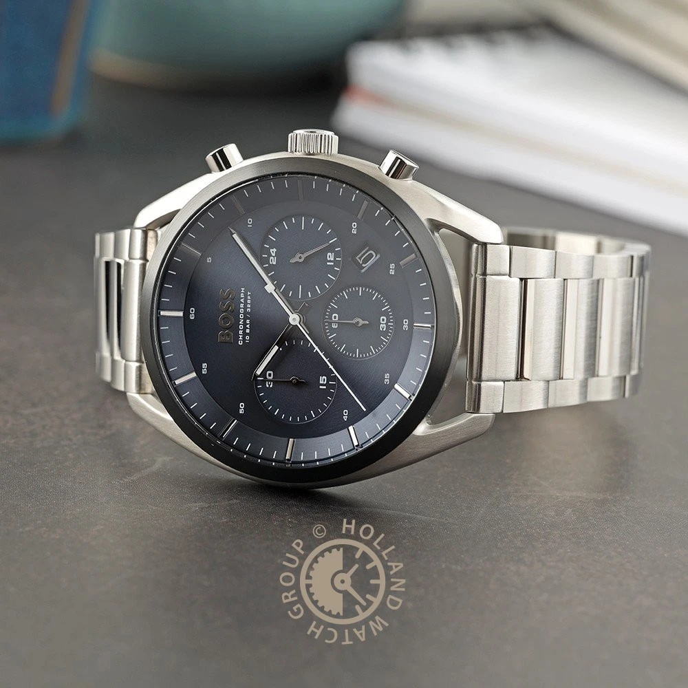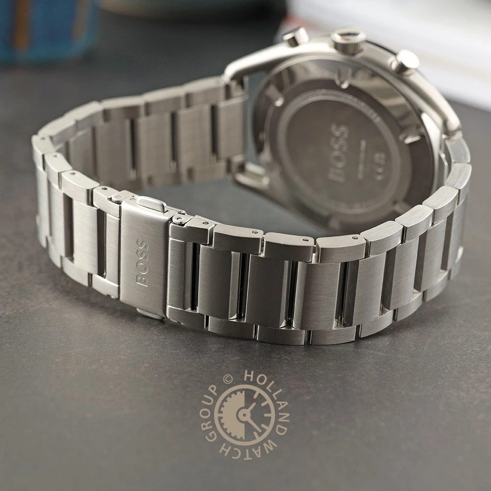 This Hugo Boss watch has a case made of stainless steel with a diameter of 44 mm and is fitted with a metal band. Inside the case lies a Seiko Instruments Inc. movement and the watch features a Mineral crystal.