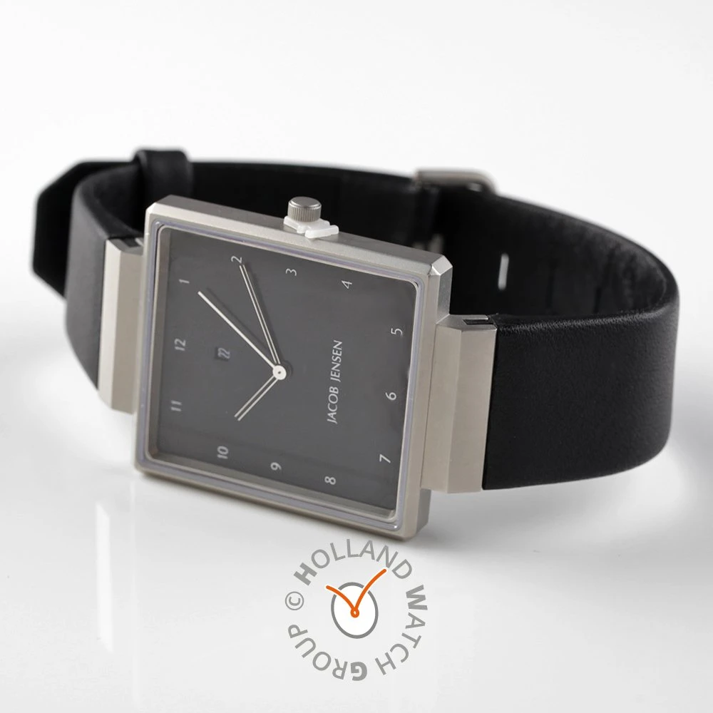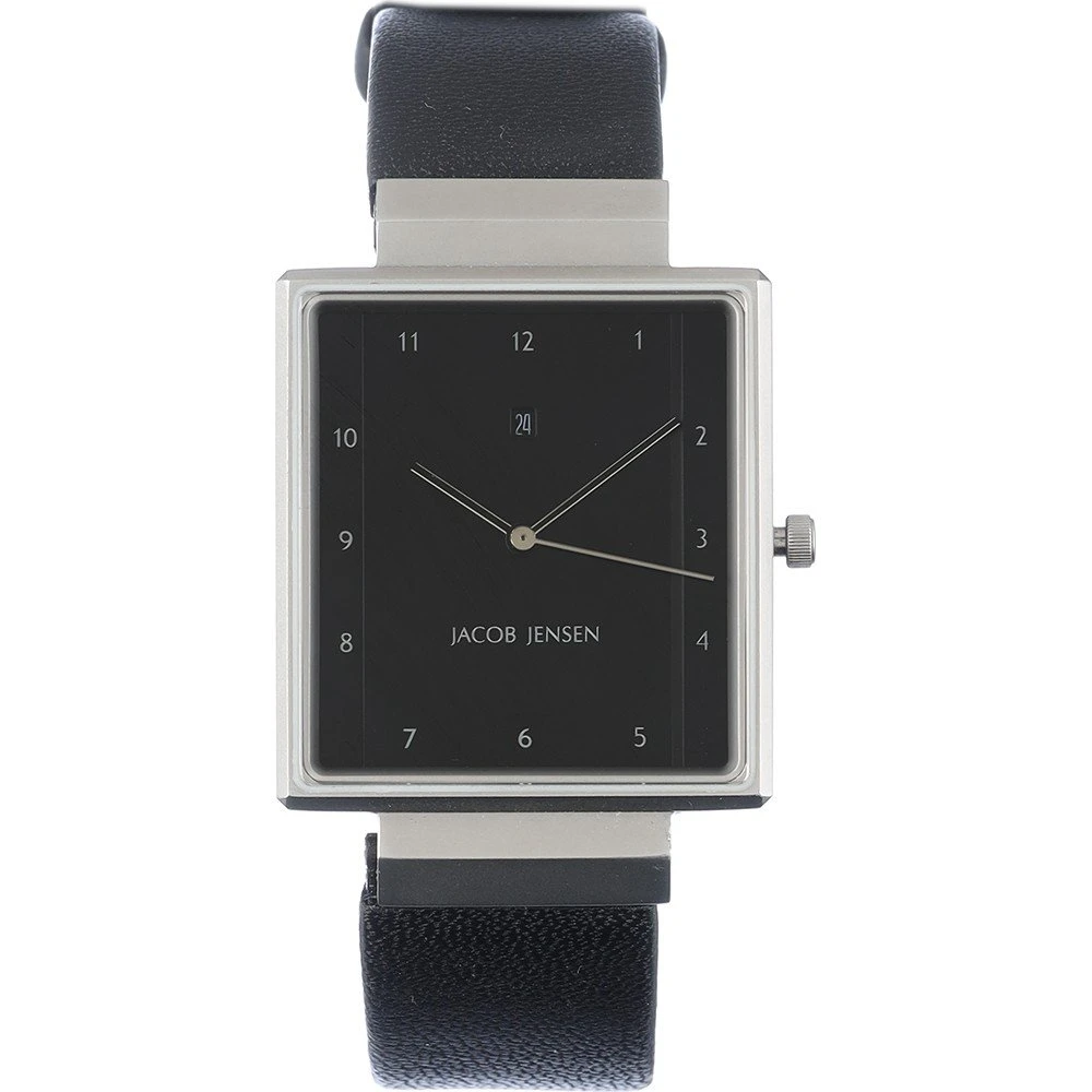 This Jacob Jensen watch has a case made of stainless steel with a diameter of 32 mm and is fitted with a leather band. Inside the case lies a Ronda movement and the watch features a Sapphire crystal.