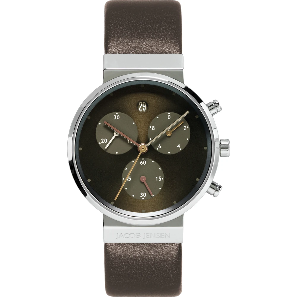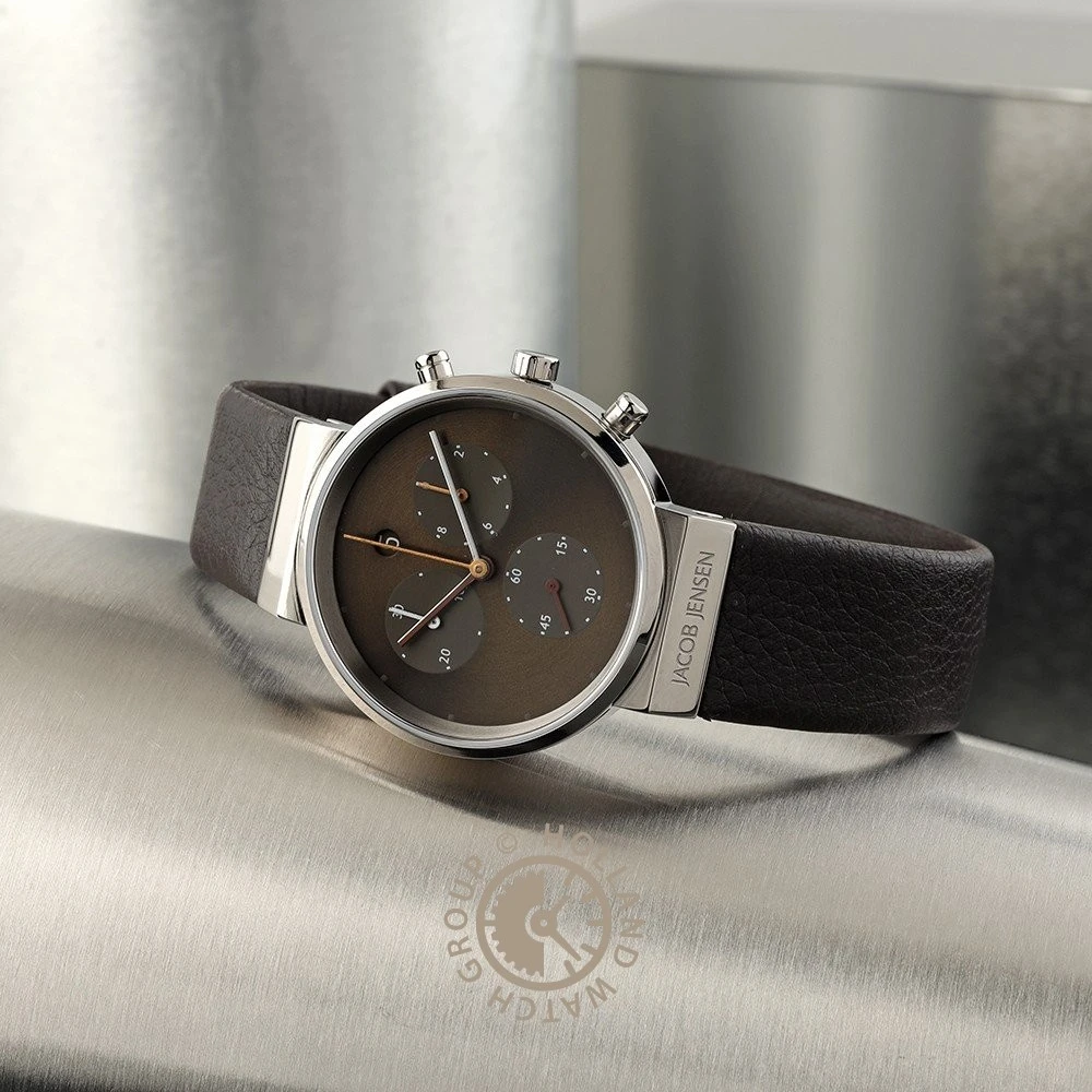 This Jacob Jensen watch has a case made of titanium with a diameter of 33 mm and is fitted with a leather band. Inside the case lies a ETA movement and the watch features a Sapphire crystal.