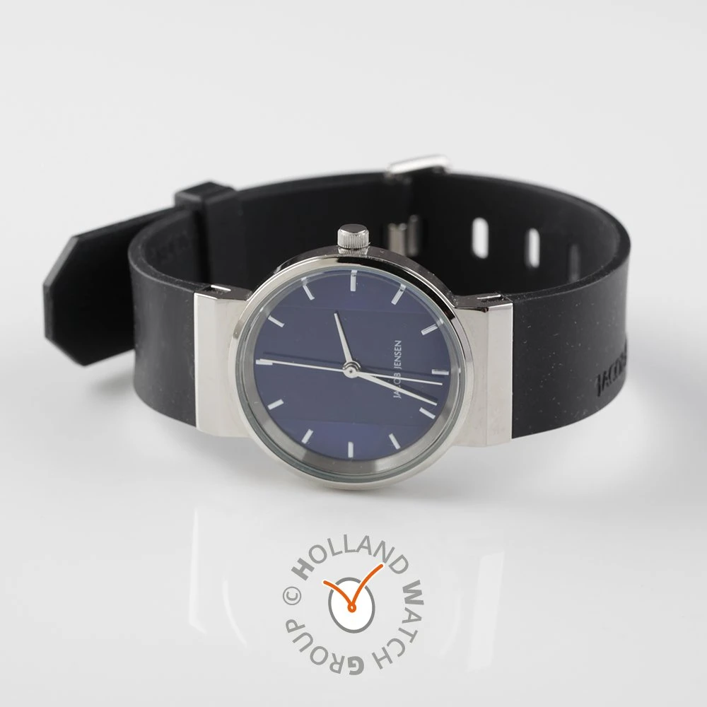 This Jacob Jensen watch has a case made of stainless steel with a diameter of 29 mm and is fitted with a rubber band. Inside the case lies a Ronda movement and the watch features a Mineral crystal.