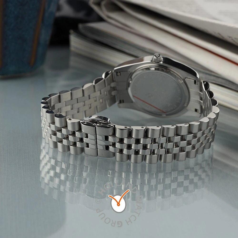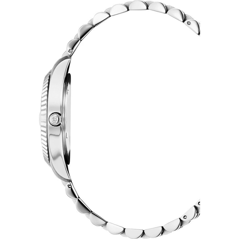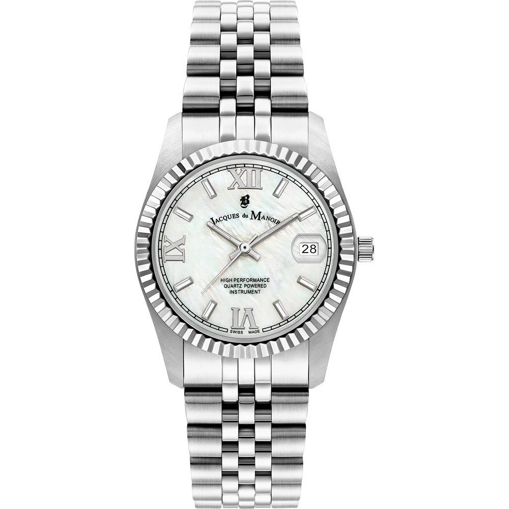 This Jacques du Manoir watch has a case made of stainless steel with a diameter of 34 mm and is fitted with a metal band.