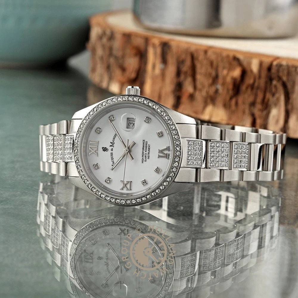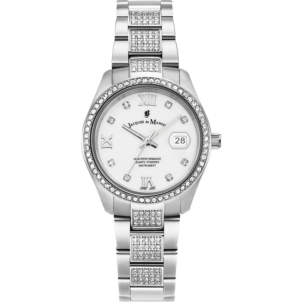 This Jacques du Manoir watch has a case made of stainless steel with a diameter of 31 mm and is fitted with a metal band. Inside the case lies a Ronda movement and the watch features a Mineral crystal.
