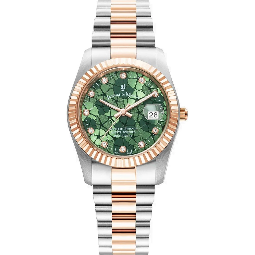 This Jacques du Manoir watch has a case made of stainless steel with a diameter of 34 mm and is fitted with a metal band. Inside the case lies a Ronda movement and the watch features a Mineral crystal.