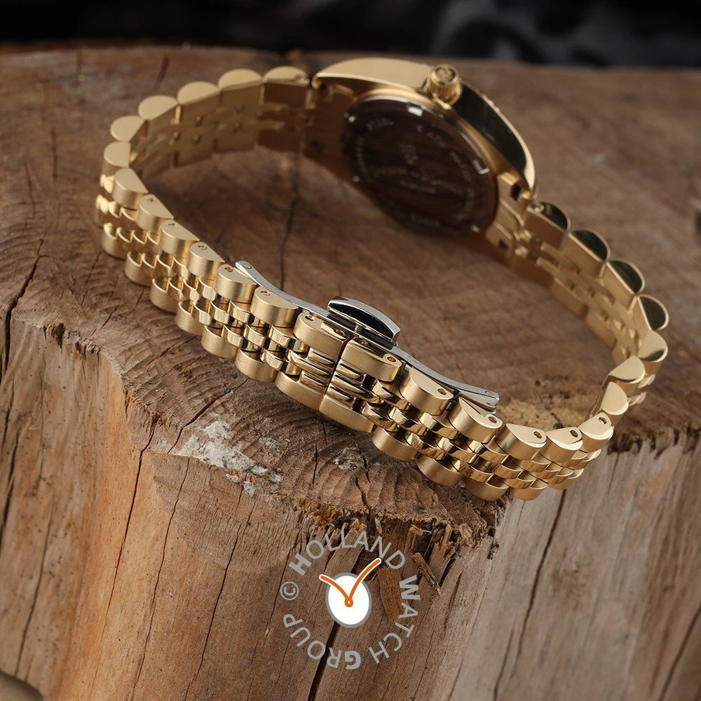 This Jacques du Manoir watch has a case made of stainless steel with a diameter of 26 mm and is fitted with a metal band.