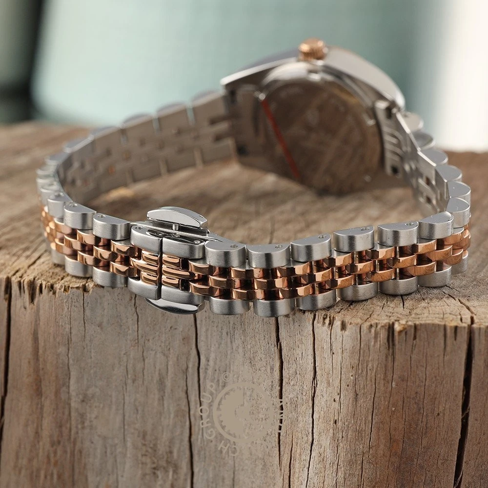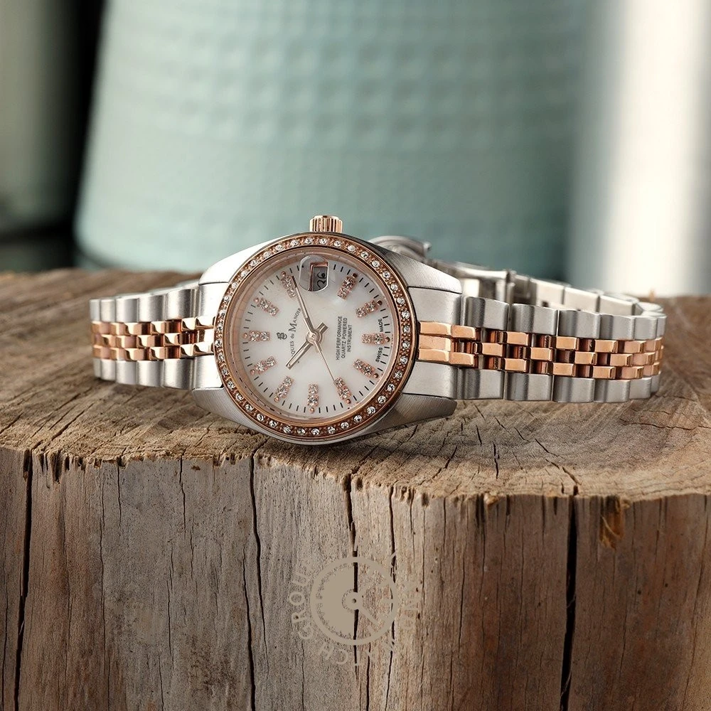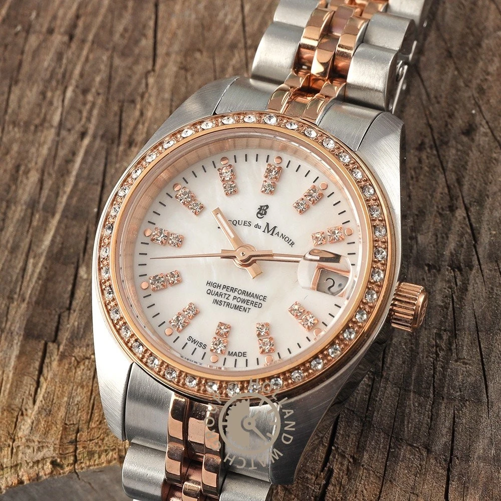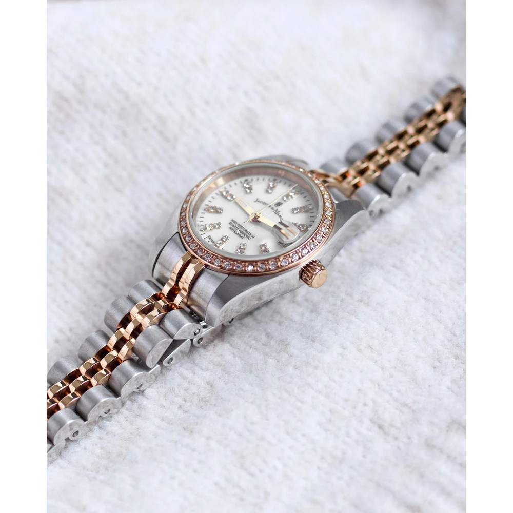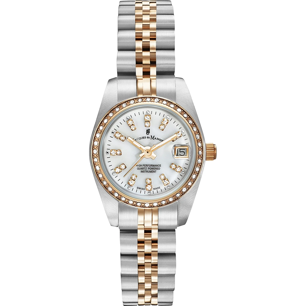 This Jacques du Manoir watch has a case made of stainless steel with a diameter of 26 mm and is fitted with a metal band.