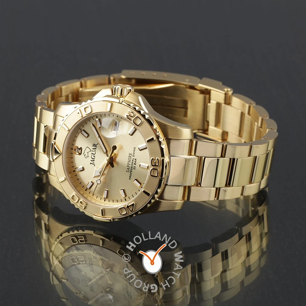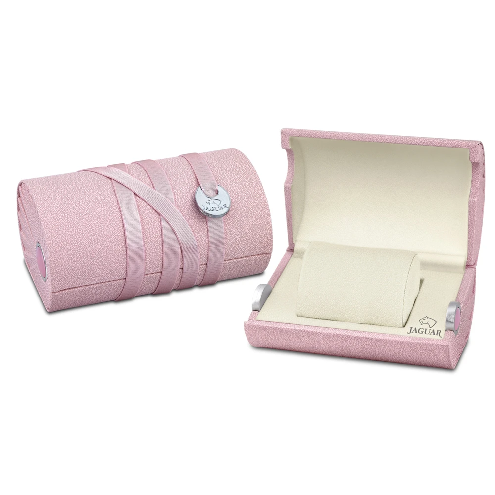 This Jaguar watch has a stainless steel case 34 mm in diameter and is fitted with a metal strap. Inside the case lies a Ronda movement and the watch features a Sapphire crystal.