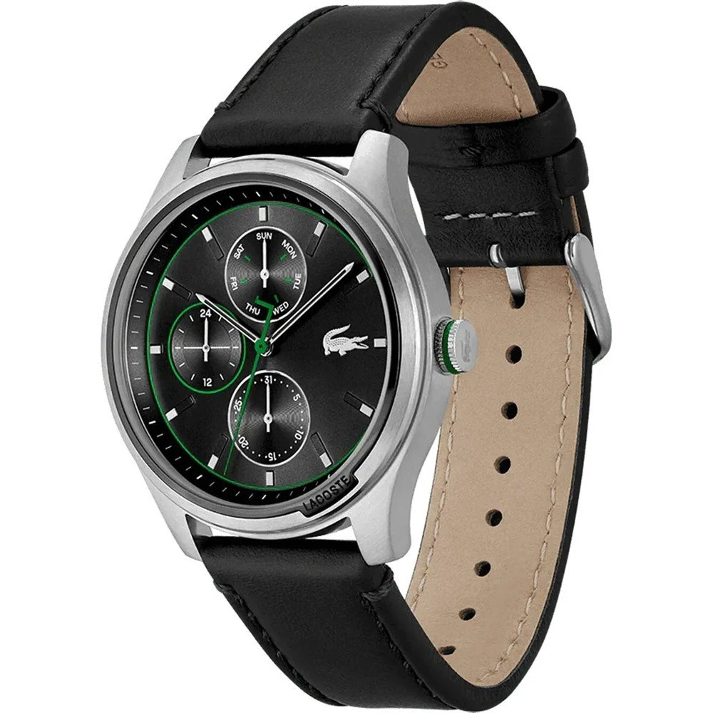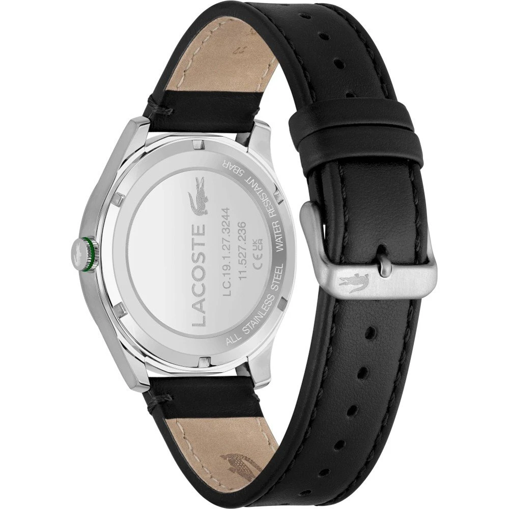 This Lacoste watch has a case made of stainless steel with a diameter of 44 mm and is fitted with a leather band. Inside the case lies a Seiko Instruments Inc. movement and the watch features a Mineral crystal.