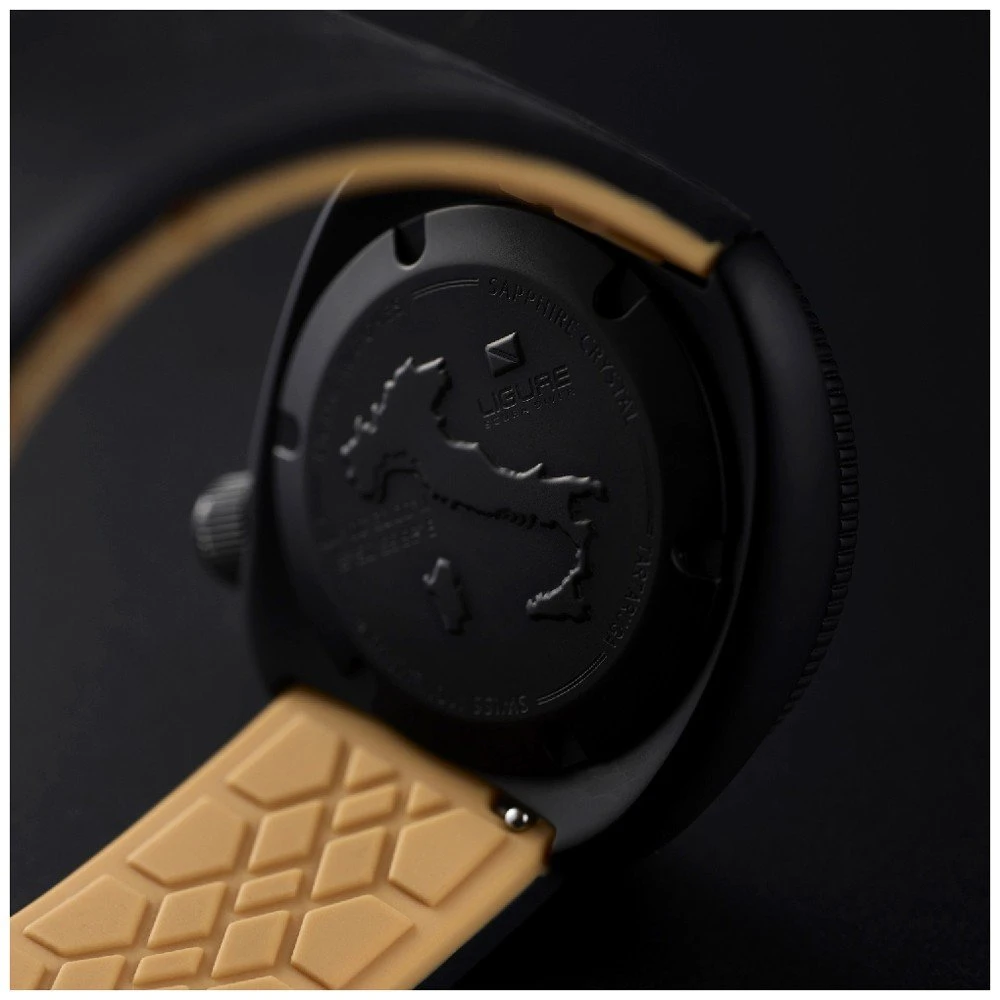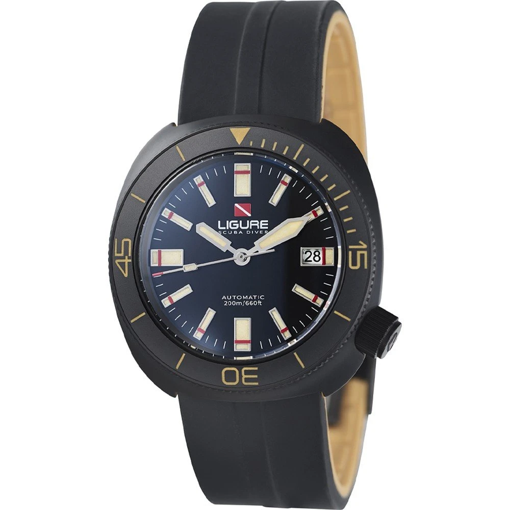 This Ligure watch has a stainless steel case 41 mm in diameter and is fitted with a rubber strap. Inside the case lies a Sellita movement and the watch features a Sapphire crystal.