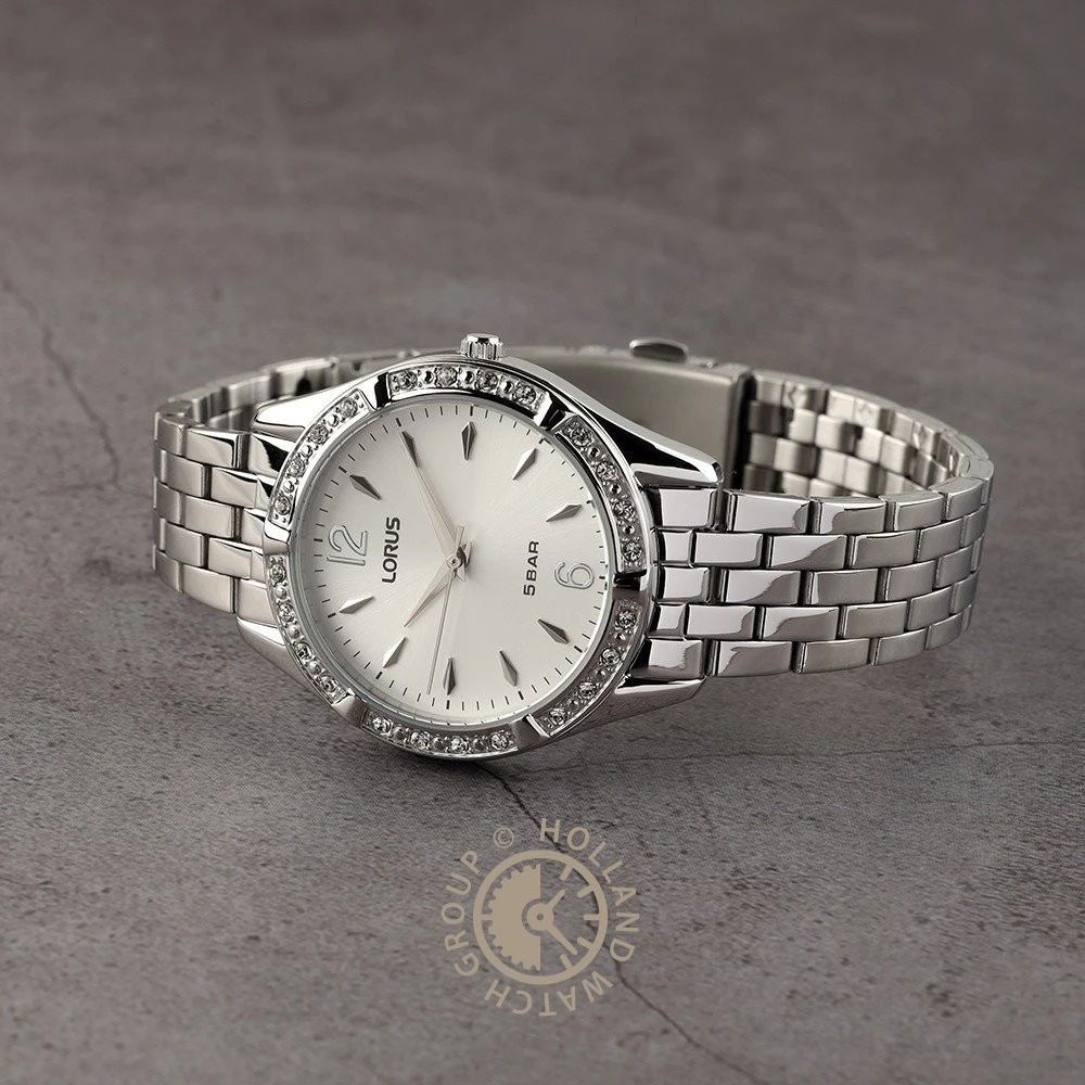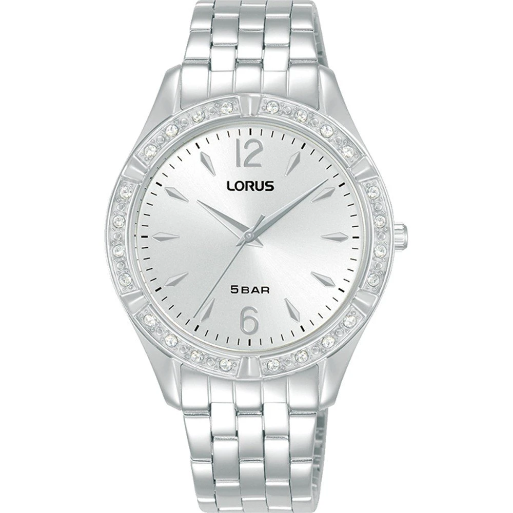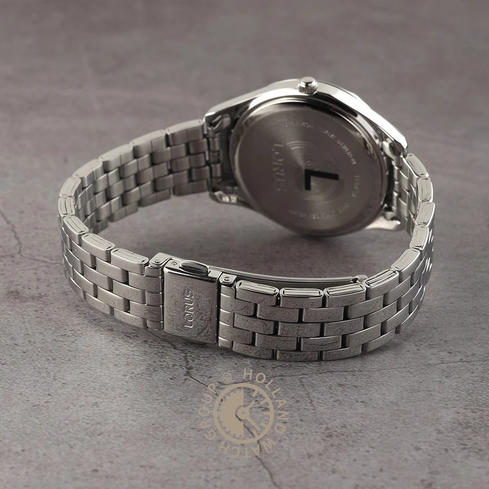 This Lorus watch has a case made of stainless steel with a diameter of 34 mm and is fitted with a metal band. Inside the case lies a Seiko Instruments Inc. movement and the watch features a Hardlex crystal crystal.