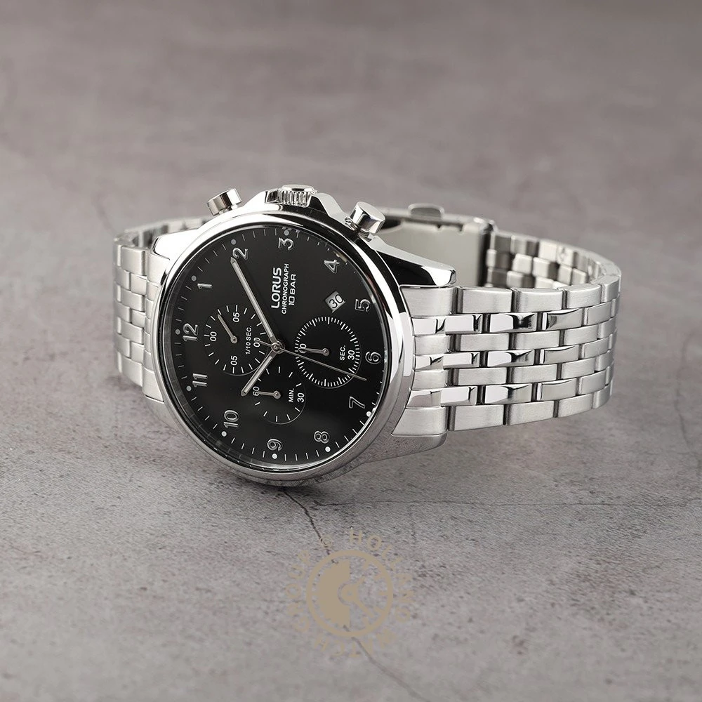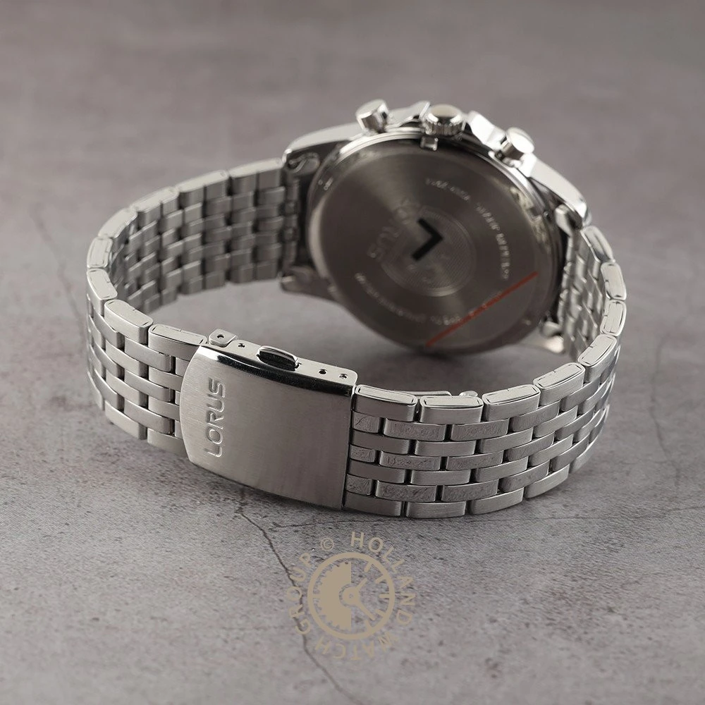 This Lorus watch has a case made of stainless steel with a diameter of 43 mm and is fitted with a metal band. Inside the case lies a Seiko Instruments Inc. movement and the watch features a Hardlex crystal crystal.