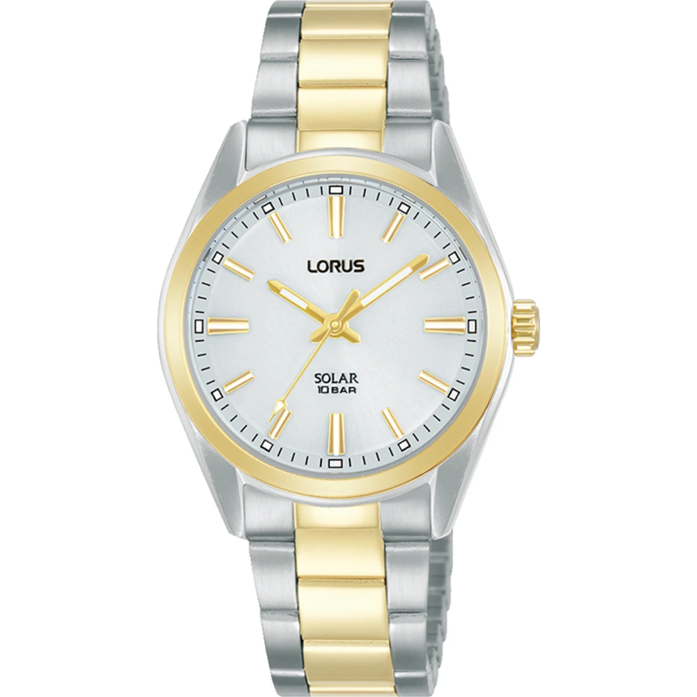 This Lorus watch has a case made of stainless steel with a diameter of 31 mm and is fitted with a metal band. Inside the case lies a Seiko movement and the watch features a Hardlex crystal crystal.