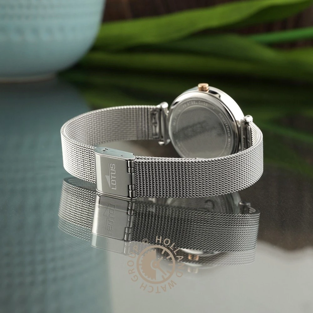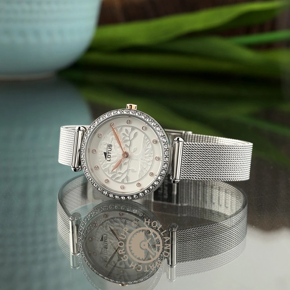 This Lotus watch has a case made of stainless steel with a diameter of 29 mm and is fitted with a metal band. Inside the case lies a Miyota movement and the watch features a Mineral crystal.