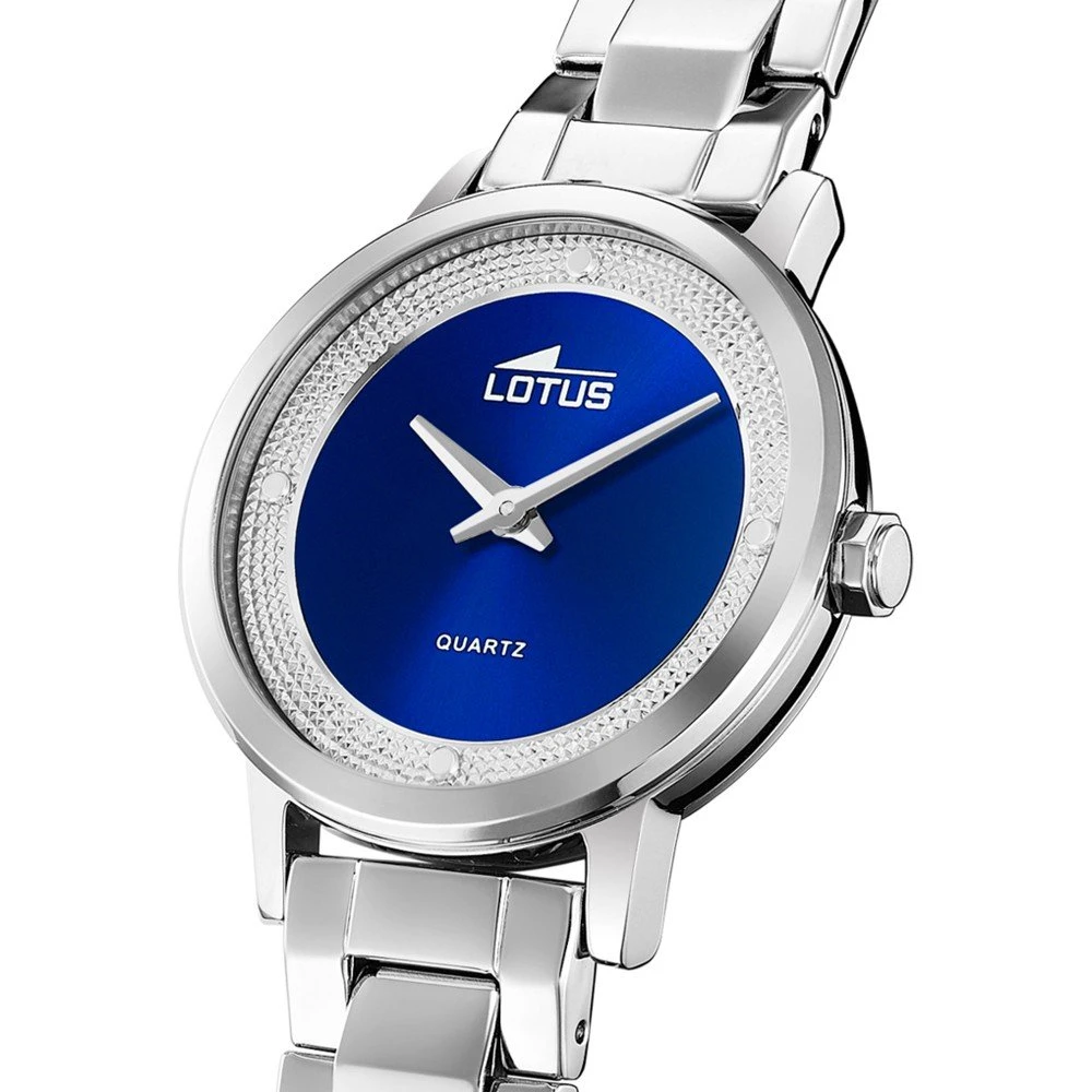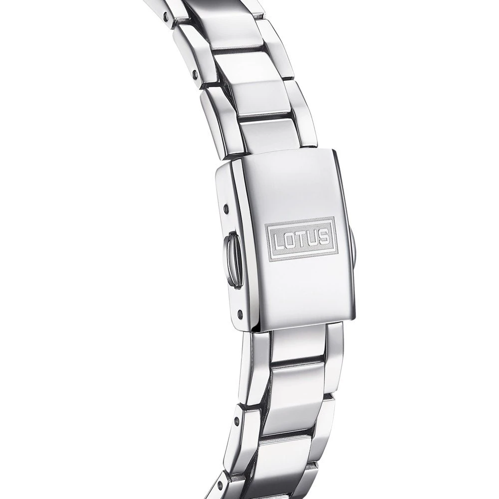 This Lotus watch has a case made of stainless steel with a diameter of 32 mm and is fitted with a metal band. Inside the case lies a Miyota movement and the watch features a Mineral crystal.