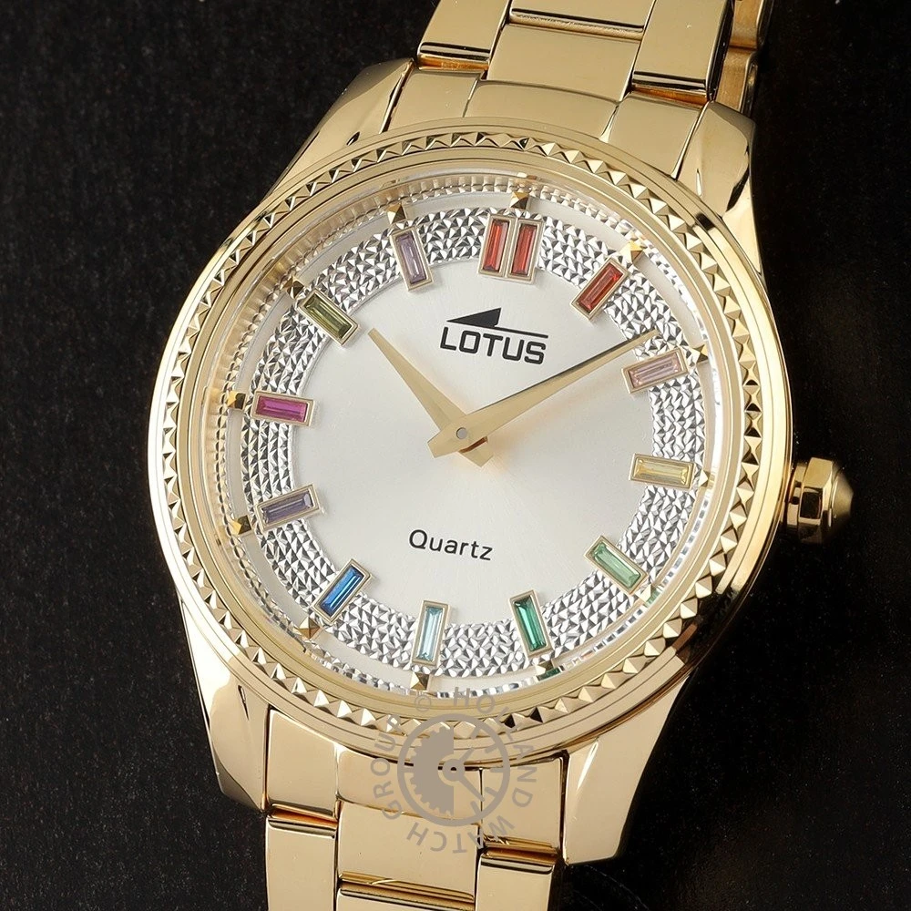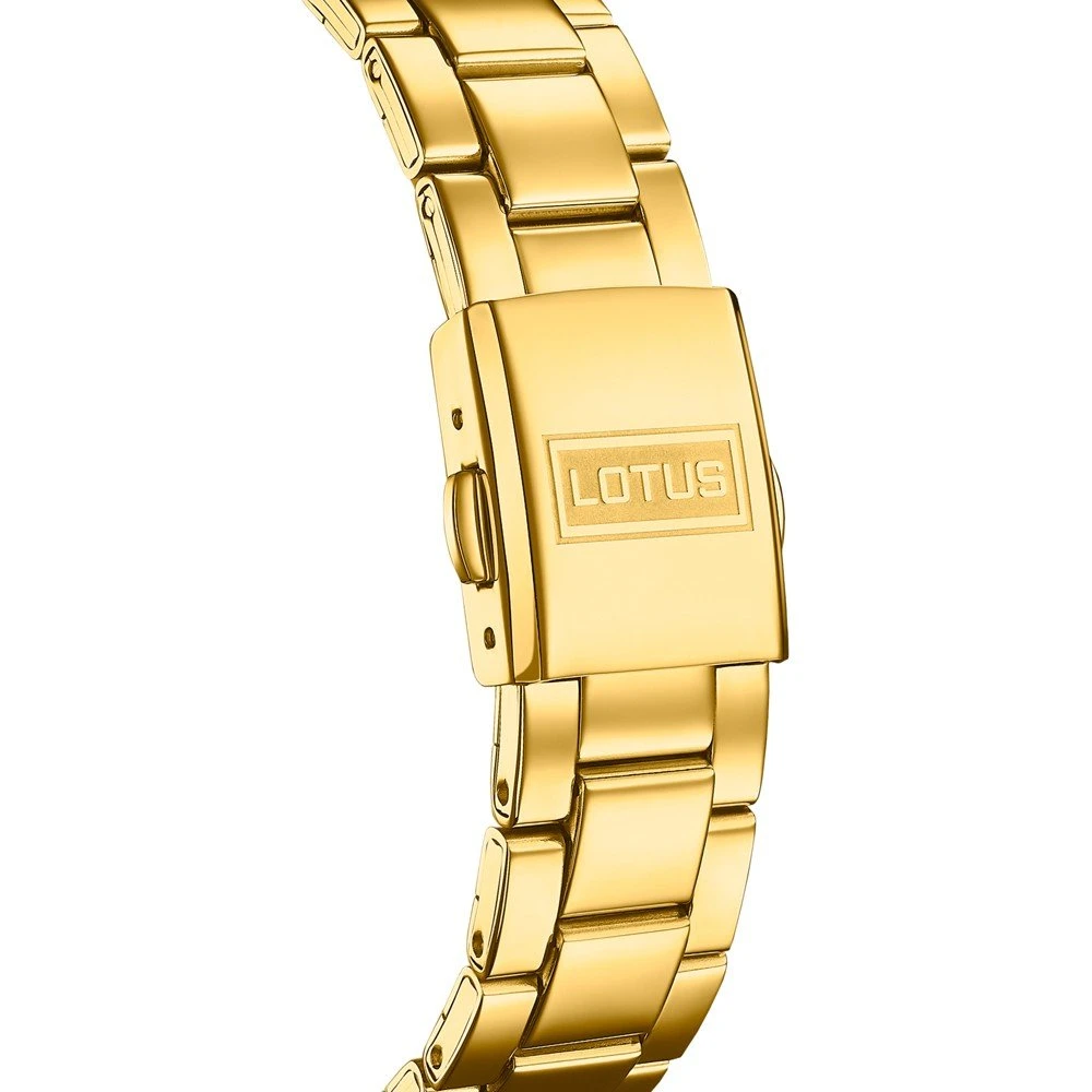 This Lotus watch has a case made of stainless steel with a diameter of 38 mm and is fitted with a metal band. Inside the case lies a Miyota movement and the watch features a Mineral crystal.