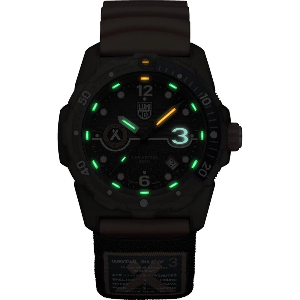 This Luminox watch has a carbon case 42 mm in diameter and is fitted with a rubber strap. Inside the case lies a Ronda movement and the watch features a Hardened mineral crystal.
