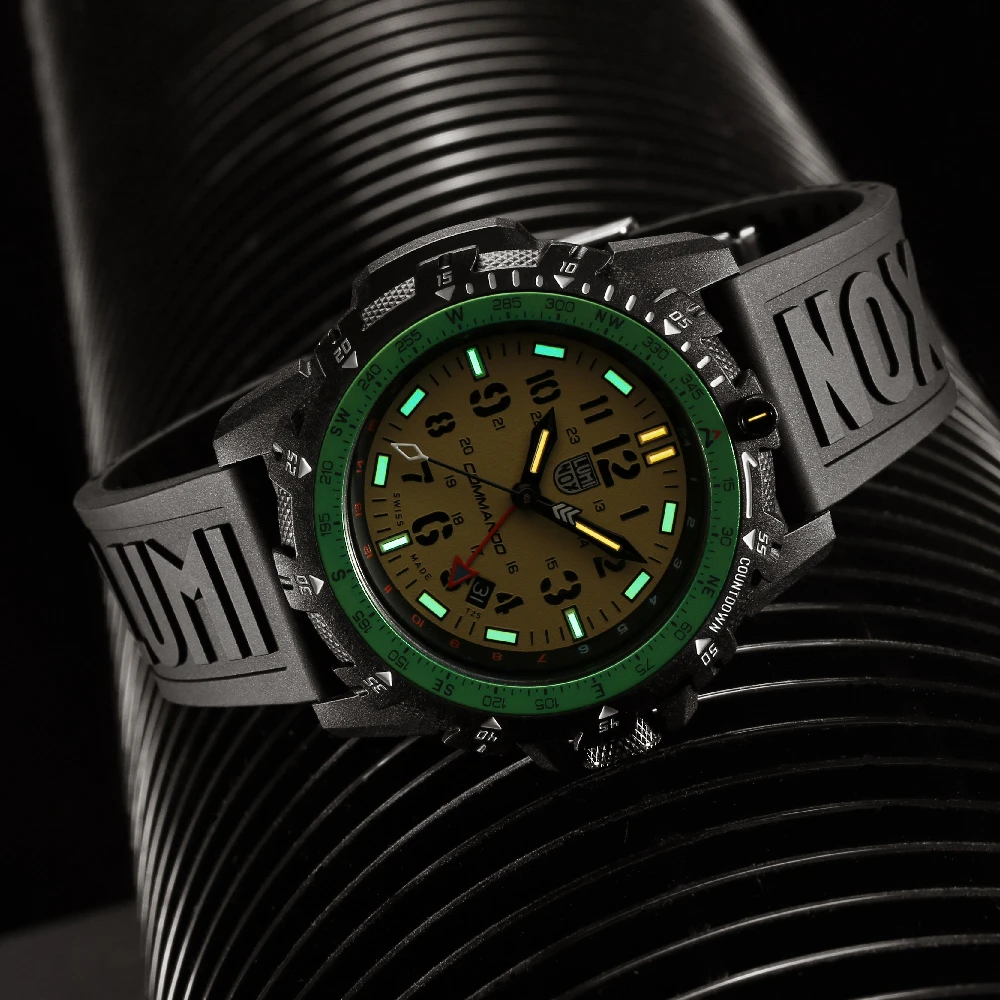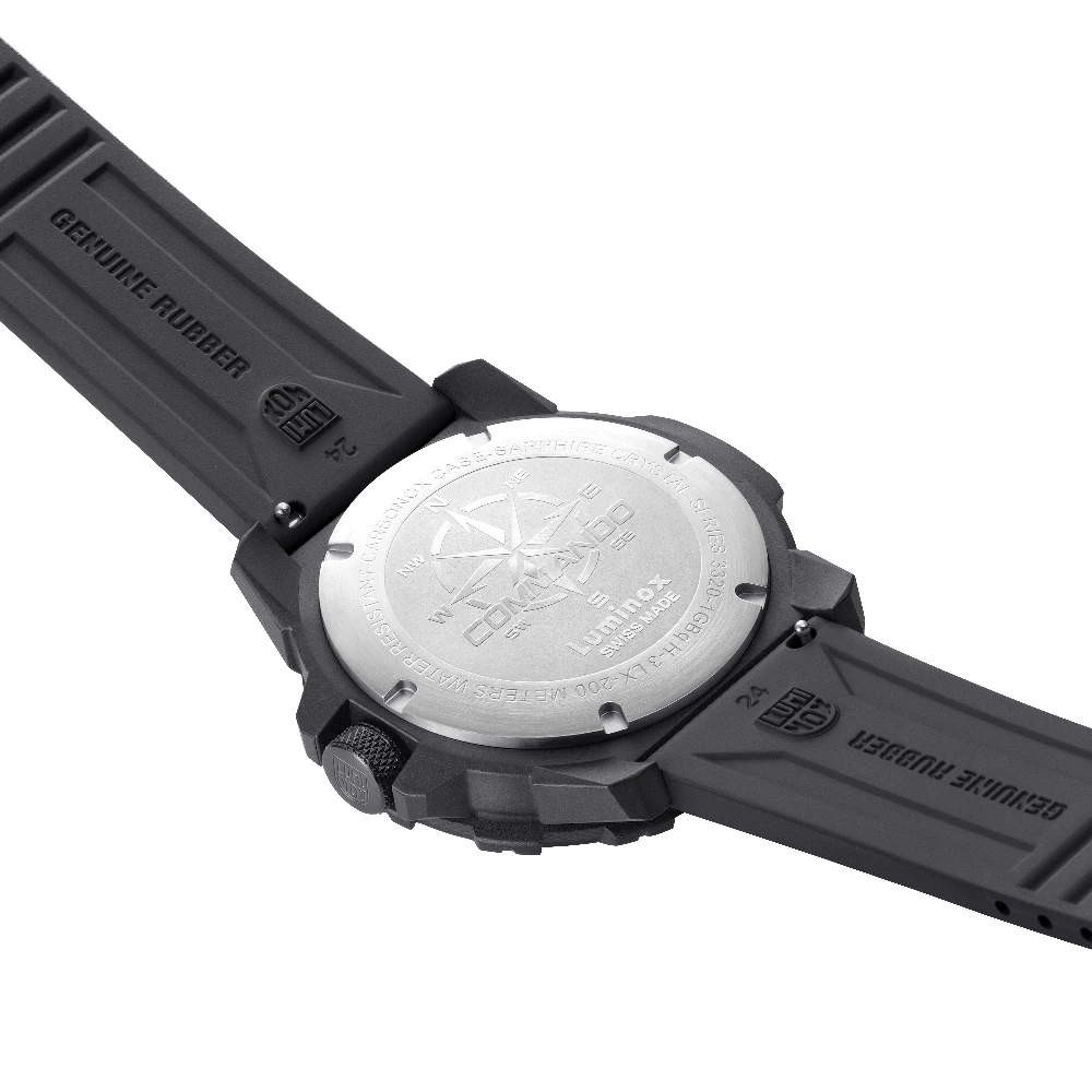 This Luminox watch has a carbon case 46 mm in diameter and is fitted with a rubber strap. Inside the case lies a Ronda movement and the watch features a Single anti-reflective sapphire crystal.